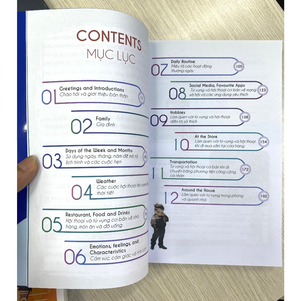 - 500+ mẫu câu thông dụng thuộc 12 chủ đề thiết thực (tương ứng 12 chương): Từ chào hỏi, giới thiệu bản thân; hội thoại ở công sở, khi mua sắm; diễn tả sở thích, thời tiết, lịch trình, di chuyển… Đây là những chủ đề đơn giản nhất, có vẻ quá cơ bản, nhưng sẽ đảm bảo bạn TỒN TẠI ĐƯỢC nếu lỡ có một ngày lạc chân ra ngoại quốc.