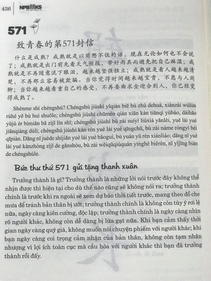 Quyển sách này viết lên những bức thư, gửi đến chúng ta 1001 lần cảm động. Sau khi cảm động, chúng ta cũng sẽ học được cách kiên cường mạnh mẽ. Chúng ta không thể để cho năng lượng của đời mình mất đi, vì những cố chấp và tấm lòng thuở ban đầu. Trong cuốn sách này, chúng ta có thể tìm lại những niềm tin từng có và gặp gỡ với con người chân thật của bản thân, chân thành hoà giải với chính mình, biết được bản thân cần thay đổi điều gì, cần khắc phục điểm gì, thậm chí có thể chúc mừng những lần thất bại của chính mình, dũng cảm đối mặt với những mặt chưa hoàn hảo của bản thân. Không cần phải dồn ép bản thân trở thành người hoàn hảo hơn nữa, cũng chẳng cần ép buộc mình phải trở thành một ai khác, giống như đoá sen nở trong đầm bùn, nó vốn đã là một đoá hoa sen hoàn mỹ, chẳng cần phải so sánh với những bông hoa hồng khác, cũng chẳng cần cố gắng để trở thành một “đoá hoa sen đẹp hơn nữa”, bởi hiện tại đã là thời khắc đẹp đẽ nhất rồi.