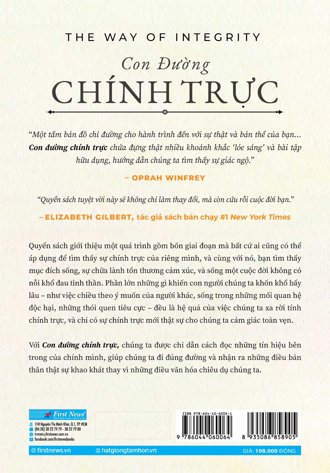 Con Đường Chính Trực Trong một thế giới đầy rẫy áp lực và những tiếng nói hỗn loạn từ bên ngoài, việc giữ được sự chính trực và toàn vẹn của chính mình không hề dễ dàng. Hiểu được thử thách đó,  – một nhà xã hội học, diễn giả và là nhà khai vấn có uy tín – đã mang đến cuốn sách “” (tựa gốc: The Way of Integrity), như một lời mời gọi sâu sắc và chân thành, khuyến khích mỗi người quay trở về với bản thân.
