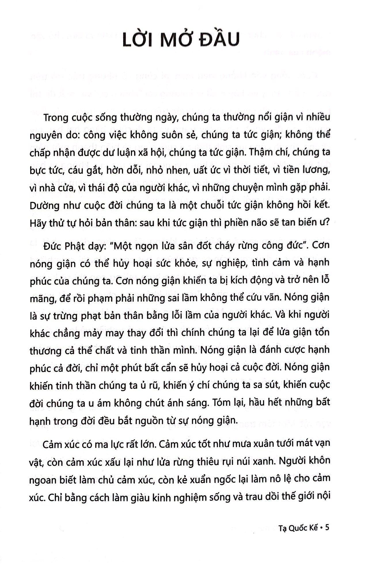 Trong cuộc sống thường ngày, chúng ta thường nổi giận vì nhiều nguyên do: công việc không suôn sẻ, chúng ta tức giận; bị người khác hiểu nhầm, chúng ta tức giận; thấy việc chướng tai gai mắt, chúng ta tức giận; không thể chấp nhận được dư luận xã hội, chúng ta tức giận. Thậm chí, chúng ta bực tức, cáu gắt, hờn dỗi, nhỏ nhen, uất ức vì thời tiết xấu, vì tiền lương thấp, vì nhà cửa bừa bộn, vì thái độ của người khác, vì những chuyện không may mà m.ình gặp phải. Dường như cuộc đời chúng ta là một chuỗi tức giận không hồi kết. Hãy thử tự hỏi bản thân: sau khi tức giận thì phiền não sẽ tan biến ư?