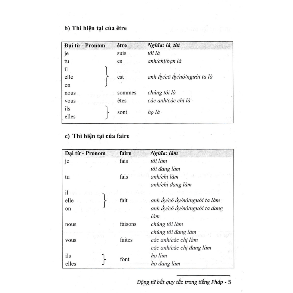 Động từ bất quy tắc (BQT) tiếng Pháp là loại động từ không theo một quy tắc thông thường nào. Để có thể tạo thuận lợi cho người học, quyển “Động từ bất quy tắc trong tiếng Pháp” được biên soạn sẽ giúp cho các bạn học sinh, học viên dễ dàng trau dồi động từ bất quy tắc tiếng Pháp, cũng như sử dụng chúng được thuần thục hơn.