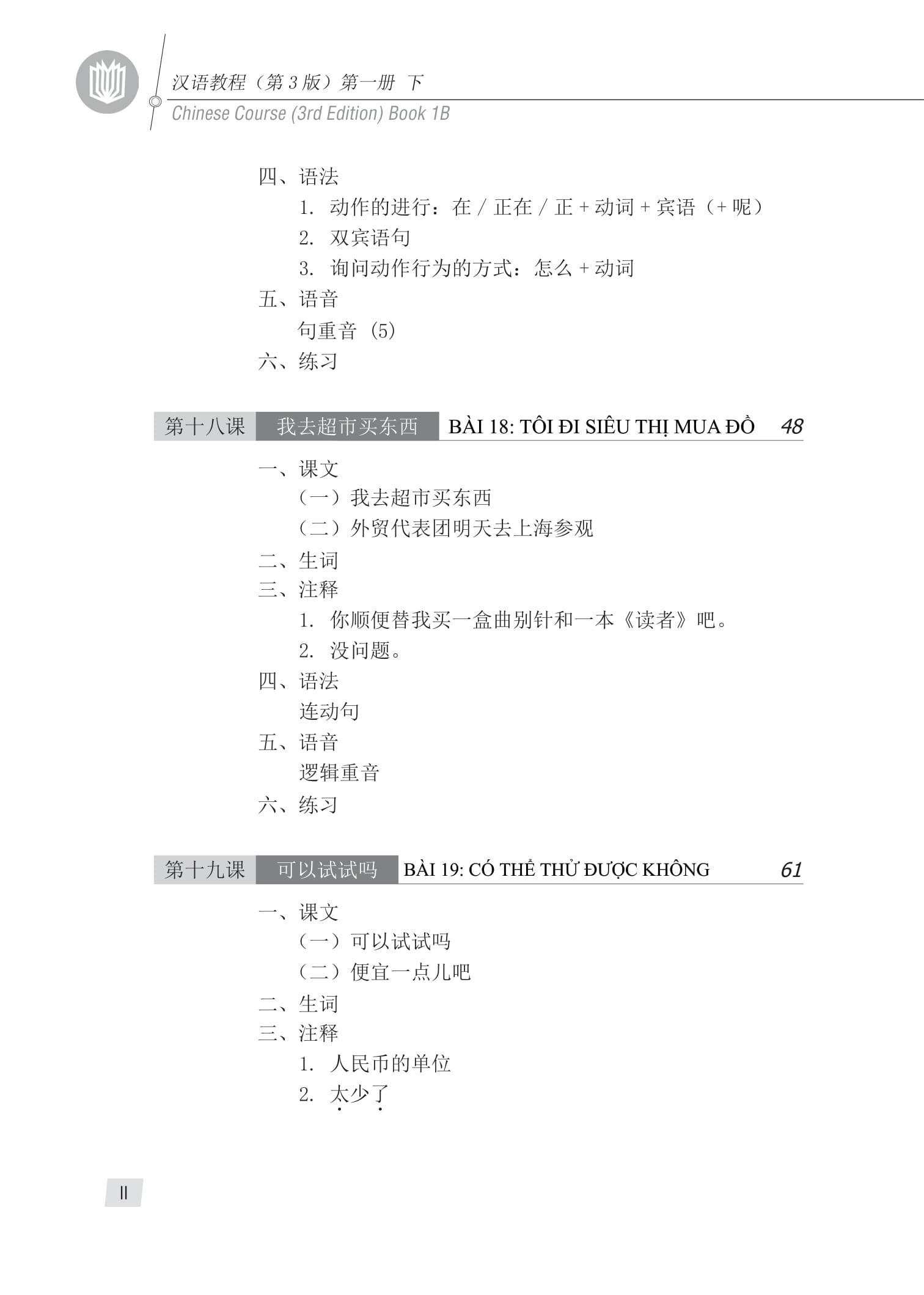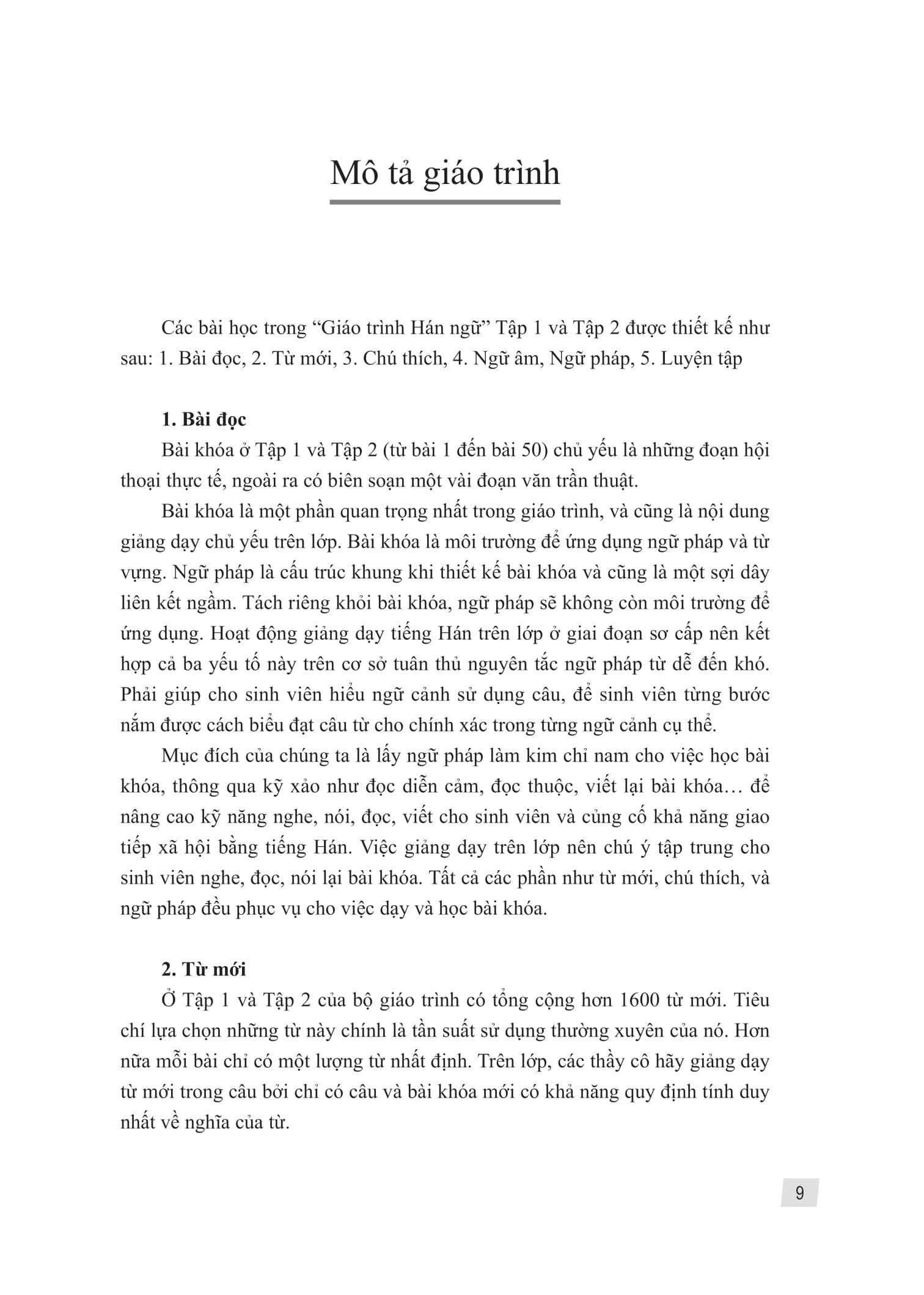 Các bài học trong “Giáo trình Hán ngữ 2 Tập 1 Quyển hạ phiên bản 3″ được thiết kế như sau: 1. Bài đọc, 2. Từ mới, 3. Chú thích, 4. Ngữ âm, Ngữ pháp, 5. Luyện tập