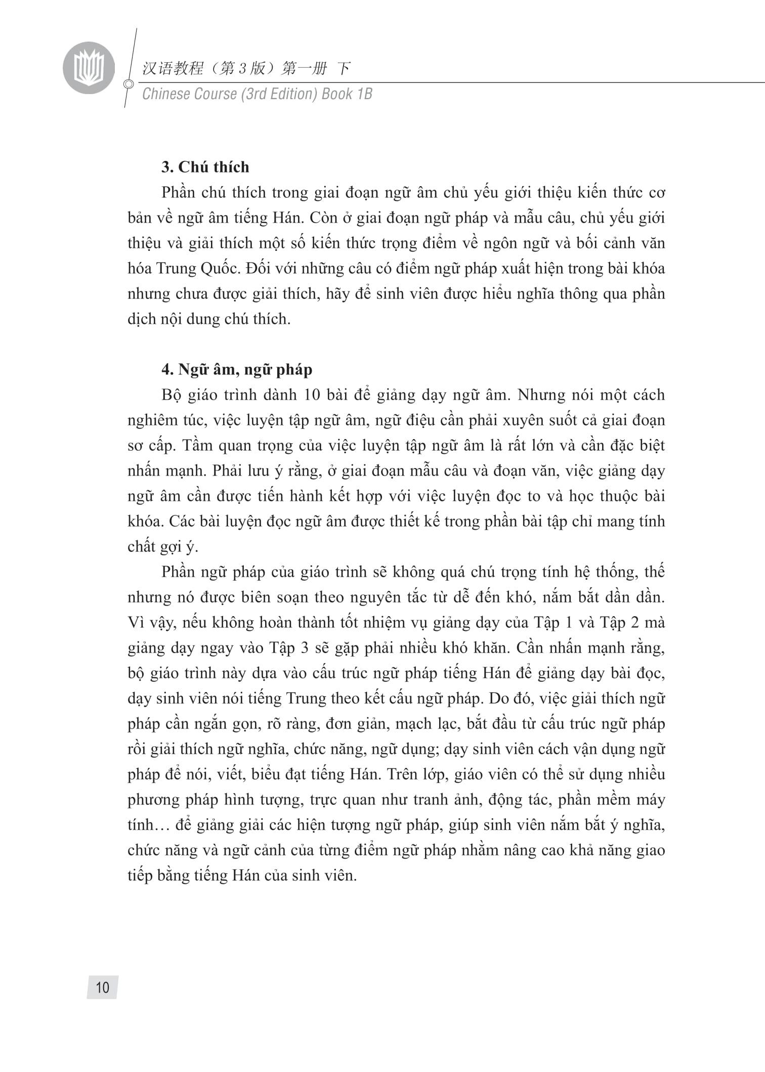 Phần chú thích trong giai đoạn ngữ âm chủ yếu giới thiệu kiến thức cơ bản về ngữ âm tiếng Hán. Còn ở giai đoạn ngữ pháp và mẫu câu, chủ yếu giới thiệu và giải thích một số kiến thức trọng điểm về ngôn ngữ và bối cảnh văn hóa Trung Quốc. Đối với những câu có điểm ngữ pháp xuất hiện trong bài khóa nhưng chưa được giải thích, hãy để sinh viên được hiểu nghĩa thông qua phần dịch nội dung chú thích.