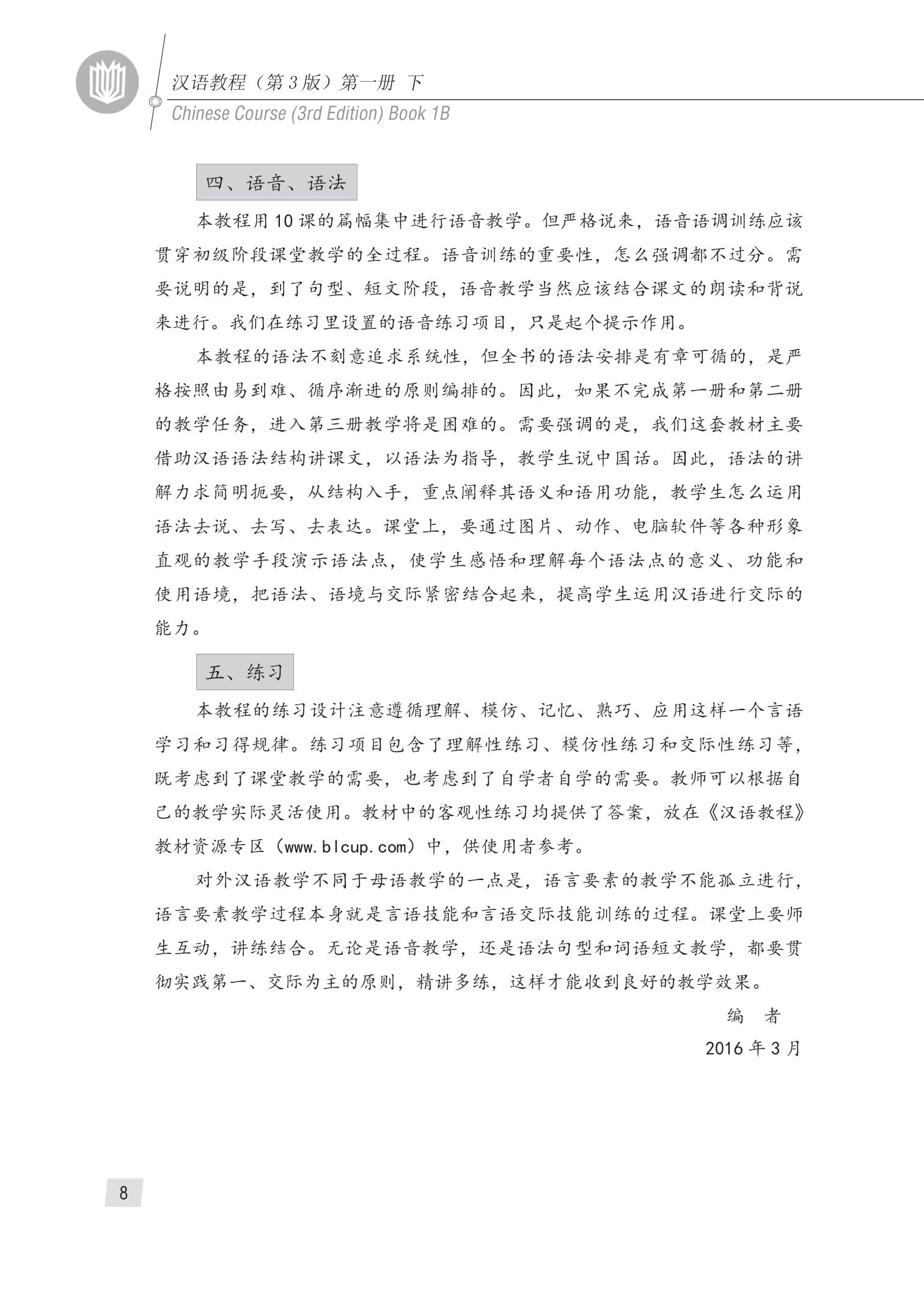 Bộ giáo trình dành 10 bài để giảng dạy ngữ âm. Nhưng nói một cách nghiêm túc, việc luyện tập ngữ âm, ngữ điệu cần phải xuyên suốt cả giai đoạn sơ cấp. Tầm quan trọng của việc luyện tập ngữ âm là rất lớn và cần đặc biệt nhấn mạnh. Phải lưu ý rằng, ở giai đoạn mẫu câu và đoạn văn, việc giảng dạy ngữ âm cần được tiến hành kết hợp với việc luyện đọc to và học thuộc bài khóa. Các bài luyện đọc ngữ âm được thiết kế trong phần bài tập chỉ mang tính chất gợi ý.