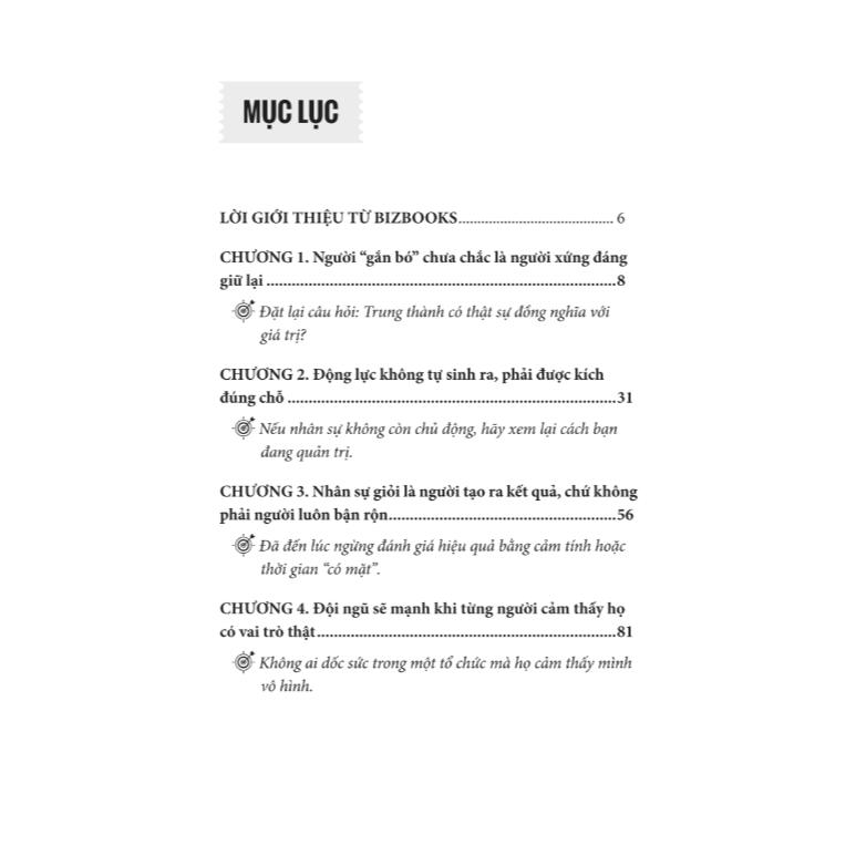 Giữ Ai Buông Ai – Cách lãnh đạo SME phân loại, nâng cấp và loại bỏ người không còn phù hợp Giữ Ai Buông Ai là cuốn sách thiết thực và dũng cảm dành cho những nhà lãnh đạo SME, giúp họ đưa ra các quyết định khó nhưng cần thiết: giữ ai, phát triển ai, và buông ai. Brian Tracy phân tích rõ rằng để xây dựng một đội ngũ mạnh, nhà lãnh đạo không chỉ cần tuyển người giỏi mà còn phải dám thay đổi, sàng lọc và tái cấu trúc nhân sự một cách khoa học. Cuốn sách đi sâu vào: Quy trình đánh giá hiệu suất nhân sự minh bạch, công bằng Chiến lược phát triển và nâng cấp nhân sự tiềm năng Kỹ năng xử lý khi buộc phải cho nghỉ những nhân viên không phù hợp Cách xây dựng văn hóa đội nhóm mạnh, giảm gánh nặng quản lý Với nhiều ví dụ thực tiễn và lời khuyên rõ ràng, Giữ Ai Buông Ai là cẩm nang đồng hành không thể thiếu cho các chủ SME và nhà quản lý muốn tái tạo nguồn lực, tiết kiệm chi phí và phát triển bền vững. Cuốn sách phù hợp cho: Chủ doanh nghiệp SME Nhà quản lý, trưởng bộ phận nhân sự Người tái cấu trúc đội ngũ Bất cứ ai đang muốn xây dựng hệ thống nhân sự hiệu quả Thông tin chi tiết cuốn sách Mã sản phẩm : 8935246957547 Năm xuất bản : 2025 Nhà xuất bản : Hồng Đức Tác giả : Brian Tracy Kích thước : 14 x 20,5 cm Số trang : 260 Công ty phát hành : Bizbooks