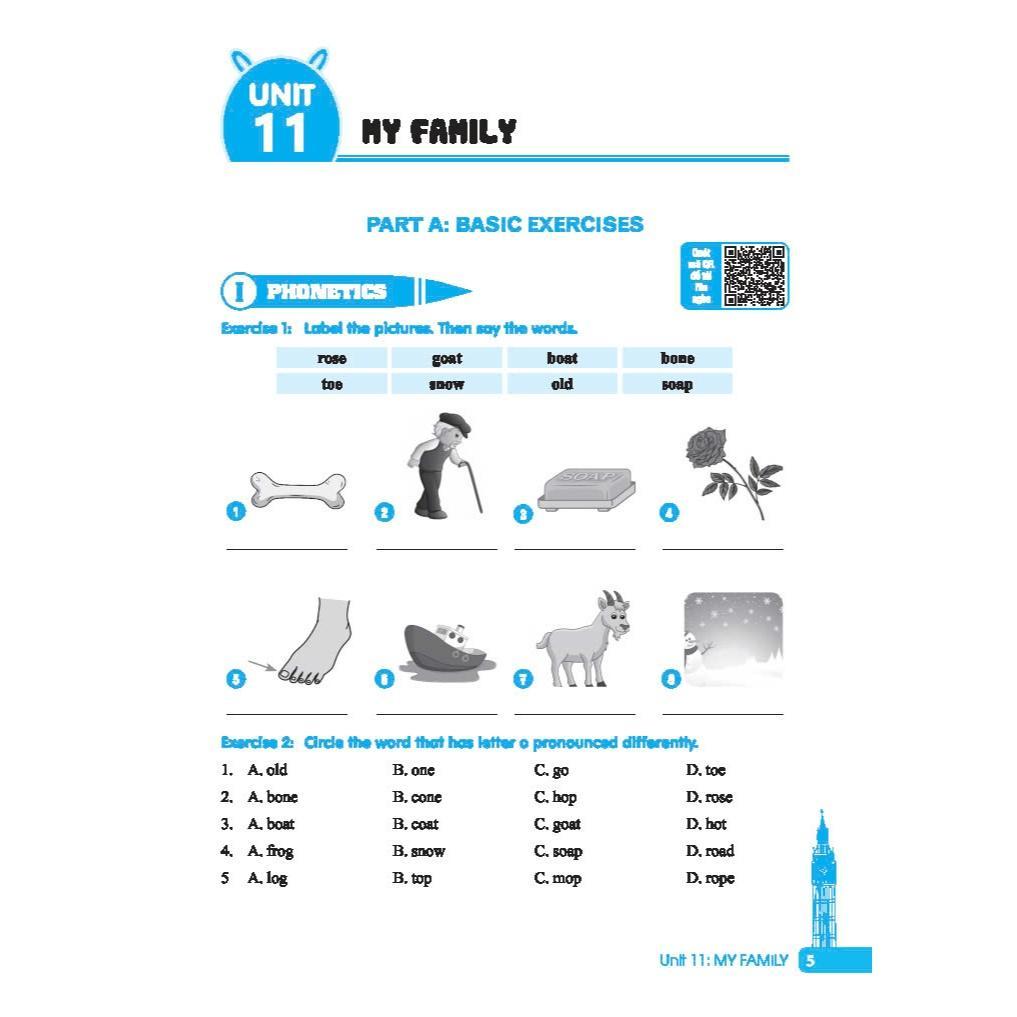 +Phần bài tập nâng cao: được thiết kế để đánh thức và phát triển kỹ năng tiếng Anh nâng cao của các em. Những bài tập ở phần này tập trung vào việc mở rộng vốn từ vựng, phát triển mạnh kiến thức ngữ pháp, rèn luyện kỹ năng đọc hiểu sâu và kỹ năng viết sáng tạo. Các em sẽ được khuyến khích tư duy linh hoạt và sáng tạo thông qua các hoạt động và bài tập đa dạng.