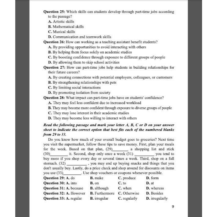 Các chủ điểm ngữ pháp và từ vựng trong mỗi đề luyện tập được tổng hợp chủ yếu từ các bài học của chương trình Tiếng Anh lớp 12 và các lớp dưới. Những chủ đề của các đoạn văn điền từ và các bài đọc trong đề luyện tập cũng liên quan đến những chủ đề của các bài học trong sách giáo khoa.