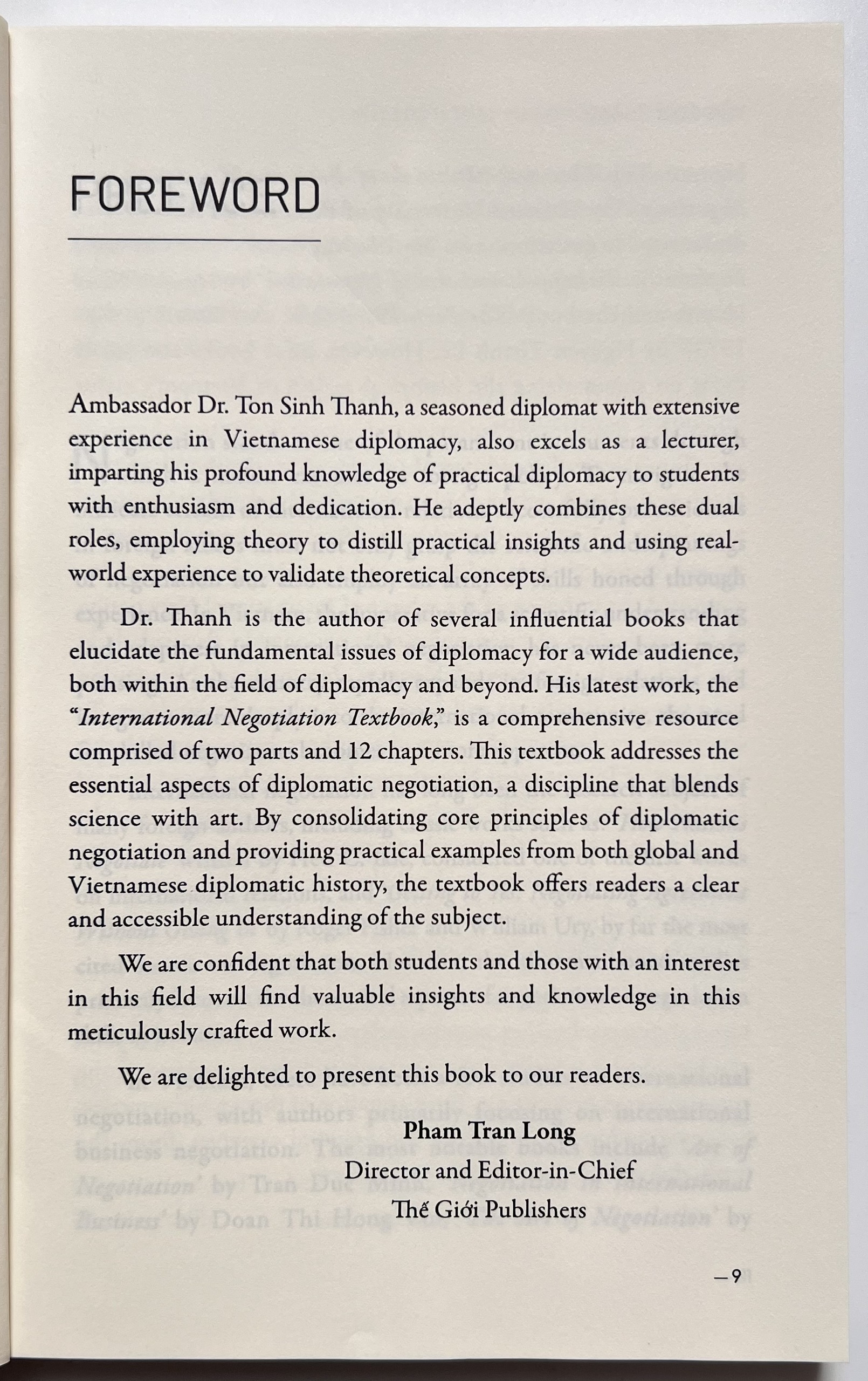 Now, in the hands of readers is the book titled "International Negotiation Textbook" by author Ton Sinh Thanh, former Ambassador Extraordinary and Plenipotentiary of our country to the Republic of India. As a professional diplomat with many years of experience in the country's diplomatic sector, the author has collected a remarkable amount of knowledge, combined with his own extremely rich practical experience to write serious works with a high content of intellectual content, such as this book