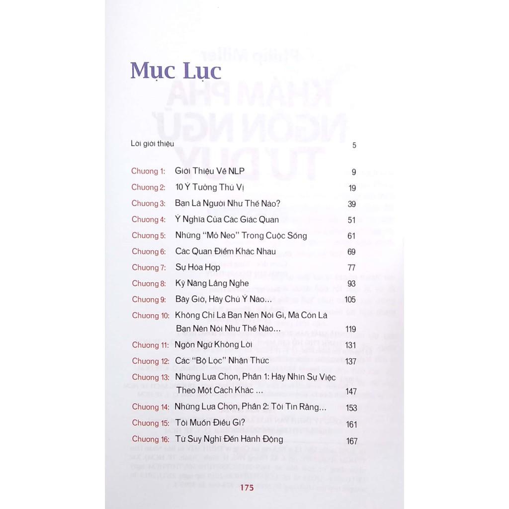 Mua tại TiktokCông ty phát hành: First News Tác Giả: Philip Miller Ngày phát hành: 2019 Số trang: 176 Kích thước:13 x 20.5 cm NXB:NXB Tổng hợp Giá bìa: 72.000VND Mô tả sản phẩm: Đây là cuốn sách tuyệt vời cho những ai muốn tìm hiểu những gì ẩn chứa sau cụm từ NLP. Nội dung sách dễ hiểu cùng với các câu chuyện và hình vẽ sinh động – một phương pháp hay để củng cố kiến thức. NLP giới thiệu những công cụ thiết thực có thể áp dụng vào các hoạt động hàng ngày để làm cho cuộc sống trở nên dễ chịu hơn.”