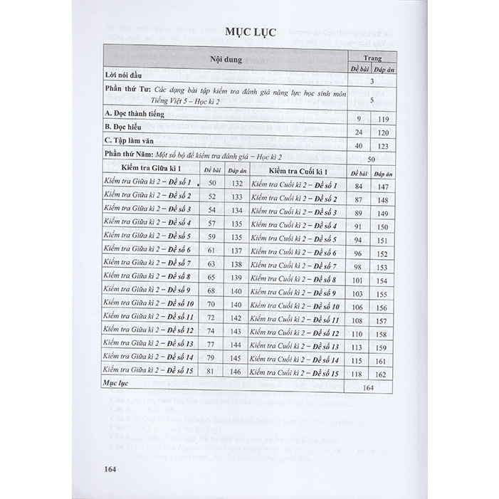 Mỗi tập gồm 30 bộ đề (15 bộ đề giữa kì và 15 bộ đề cuối kì) được biên soạn riêng cho các bộ sách: Chân trời sáng tạo, Kết nối tri thức với cuộc sống và Cánh Diều (mỗi bộ sách gồm 5 đề giữa kì và 5 đề cuối kì). Với mỗi bộ đề, chúng tôi biên soạn theo cấu trúc thống nhất, bao gồm các câu hỏi và bài tập ở 3 mức độ khác nhau được lồng ghép giữa hai hình thức trắc nghiệm và tự luận có nội dung theo chương trình Sách giáo khoa Tiếng Việt 5, Chương trình giáo dục phổ thông 2018. Phần cuối mỗi tập đều có hướng dẫn cách làm các dạng bài luyện tập cho mỗi mức độ cũng như các bộ đề kiểm tra cho từng bộ sách nhằm đáp ứng yêu cầu của học sinh và phụ huynh.