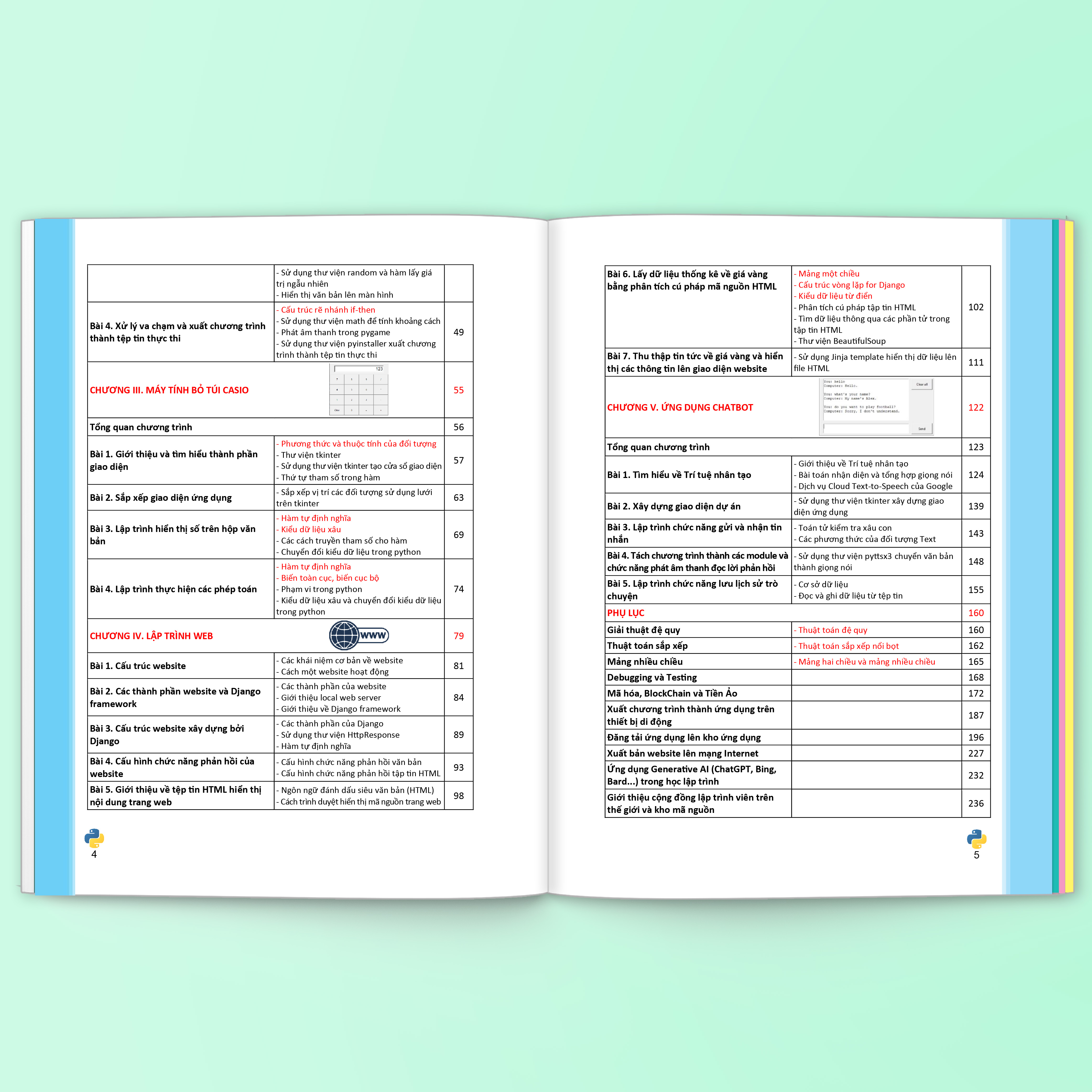 Cuốn sách gồm 06 chương: Mỗi chương là một dự án lý thú có tính thực tiễn cao từ đơn giản đến phức tạp giúp người đọc từng bước làm chủ ngôn ngữ lập trình python, đồng thời nắm bắt được hiện trạng cũng như xu hướng đang diễn ra của các sản phẩm mà lập trình viên có thể tạo ra trong cuộc sống.