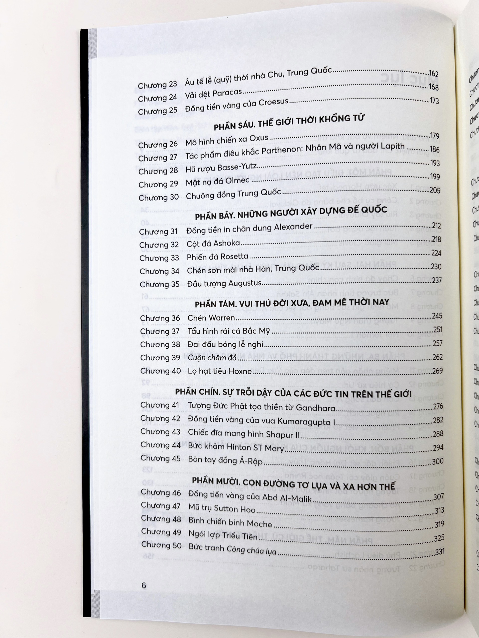 - Hình thức: Bìa mềm GIỚI THIỆU NỘI DUNG: “Lịch sử thế giới qua 100 hiện vật” được viết bởi Neil MacGregor - Nguyên Giám đốc Bảo tàng Anh (2003-2009) giúp chúng ta hiểu rõ hơn về quá trình phát triển của loài người bằng một góc nhìn mới lạ, đó là qua việc kể những câu chuyện lịch sử hấp dẫn, độc đáo xoay quanh các hiện vật tiêu biểu được trưng bày tại Bảo tàng Anh. Bảo tàng Anh được thành lập năm 1753 với định hướng là “nhắm tới giá trị phổ quát” và mở cửa tự do cho tất cả. Nơi đây đã có thâm niên hơn 250 năm sưu tầm hiện vật từ khắp thế giới, với gần 8.000.000 hiện vật được cất giữ và trưng bày tại đây, là các tác phẩm nghệ thuật vô giá và những báu vật của mọi nền văn minh của nhân loại trên thế giới – Ai Cập, Ba Tư, Hy Lạp, La Mã, Trung Hoa… Cuốn sách này là bản ghi chép từ chương trình trên đài BBC Radio 4, được phát thanh vào năm 2010, như một hoạt động đổi mới liên tục của Bảo tàng, mang lại cho Bảo tàng Anh giải thưởng “Bảo tàng của năm” (Art Fund Prize 2011). Bảo tàng và đài BBC đã chọn ra 100 hiện vật từ bộ sưu tập của Bảo tàng Anh và sắp xếp theo niên đại từ khởi nguồn lịch sử nhân loại vào khoảng hai triệu năm trước cho đến tận ngày nay. Những hiện vật đó bao quát toàn bộ thế giới, phân bố đều hết mức có thể, cố gắng đề cập đến càng nhiều khía cạnh thực tiễn trong trải nghiệm của nhân loại càng tốt, và kể cho chúng ta nghe về muôn mặt đời sống xã hội, chứ không chỉ về giới giàu sang quyền quý trong lòng nó. Bởi thế, số hiện vật này tất yếu bao gồm cả những món đồ giản dị trong đời sống thường nhật lẫn những công trình nghệ thuật kỳ vĩ. Một số hiện vật như: một công cụ chặt 2 triệu năm tuổi, một chiếc áo choàng bằng vàng của xứ Wales, tàu chiến cơ khí, tượng Phật ở Pakistan hay chiếc đồng hồ hàng hải trên tàu HMS Beagle.