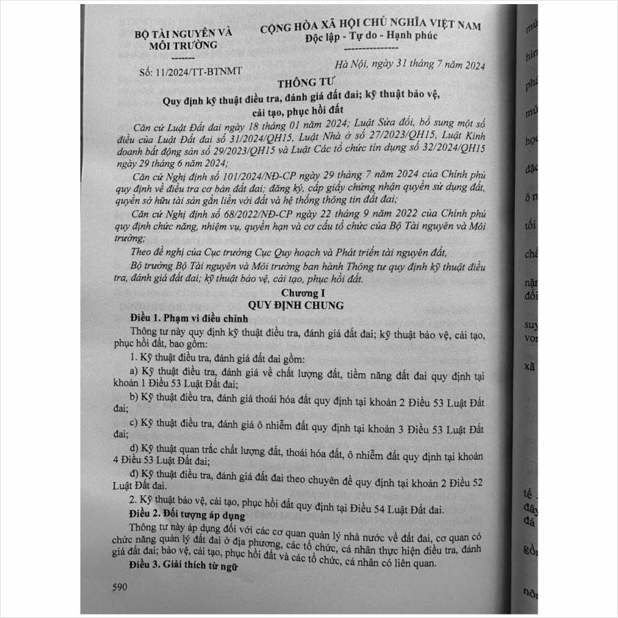 – Thông tư số 11/2024/TT-BTNMT ngày 31 tháng 7 năm 2024 của Bộ Tài nguyên và Môi trường Quy định kỹ thuật điều tra, đánh giá đất đai; kỹ thuật bảo vệ, cải tạo, phục hồi đất;