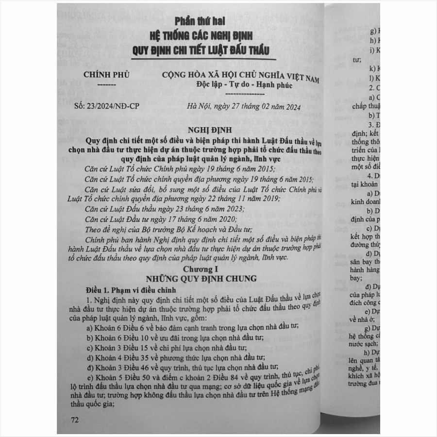 – Nghị định số 23/2024/NĐ-CP ngày 27 tháng 02 năm 2024 của Chính phủ quy định chi tiết một số điều và biện pháp thi hành Luật Đấu thầu về lựa chọn nhà đầu tư thực hiện dự án thuộc trường hợp phải tổ chức đấu thầu theo quy định của pháp luật quản lý ngành, lĩnh vực;