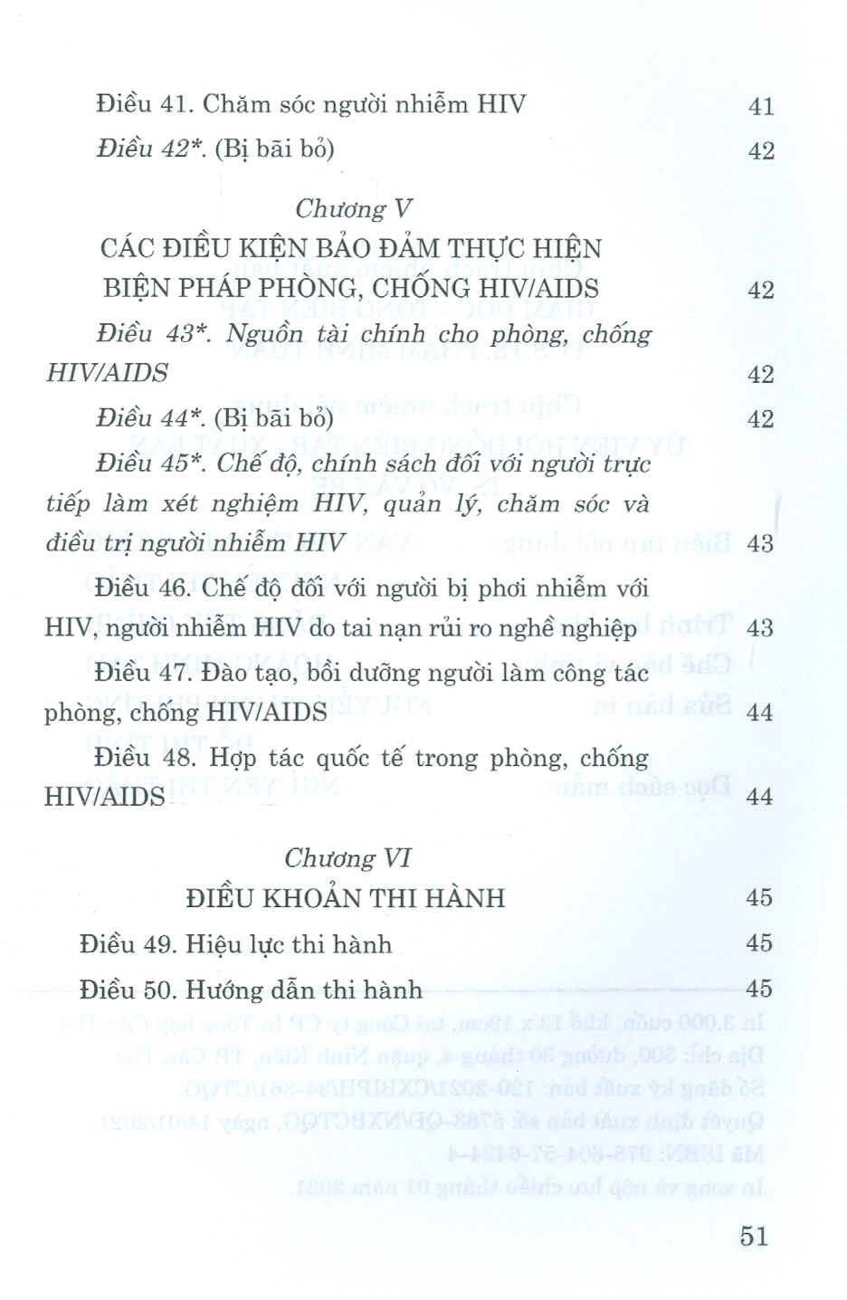Cuốn sách gồm 6 chương, 50 điều quy định các biện pháp phòng, chống HIV/AIDS; việc chăm sóc, điều dưỡng, hỗ trợ người nhiễm HIV và các điều kiện bảo đảm thực hiện biện pháp phòng, chống HIV/AIDS. Nội dung cuốn sách được hợp nhất từ Luật Phòng, chống nhiễm vi rút gây ra hội chứng suy giảm miễn dịch mắc phải ở người (HIV/AIDS) năm 2006 và Luật sửa đổi, bổ sung một số điều của Luật Phòng, chống nhiễm vi rút gây ra hội chứng suy giảm miễn dịch mắc phải ở người (HIV/AIDS) năm 2020. Luật được Quốc hội nước Cộng hòa xã hội chủ nghĩa Việt Nam khóa XIV, kỳ họp thứ 10 thông qua ngày 16/11/2020, có hiệu lực thi hành từ ngày 01/7/2021.