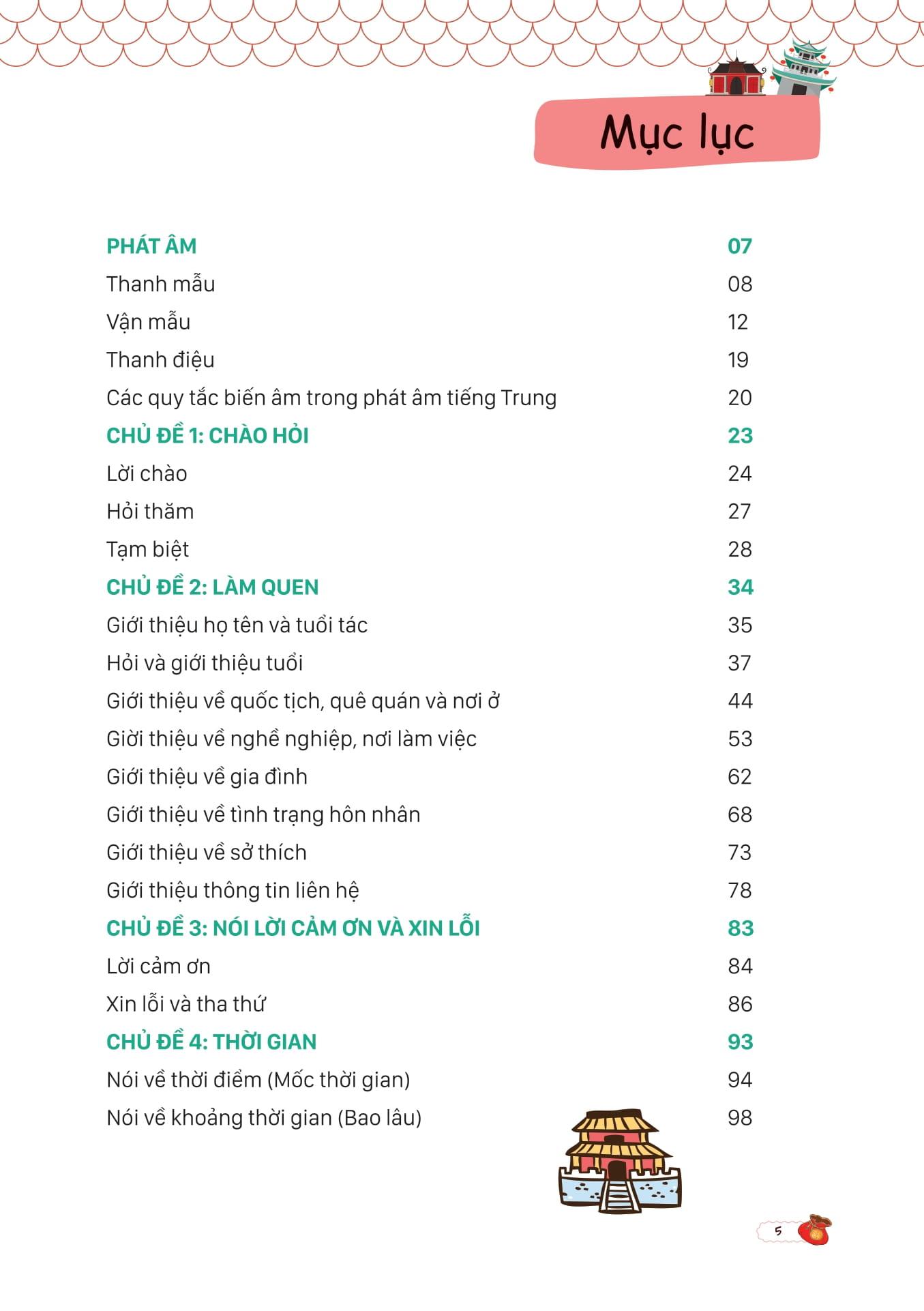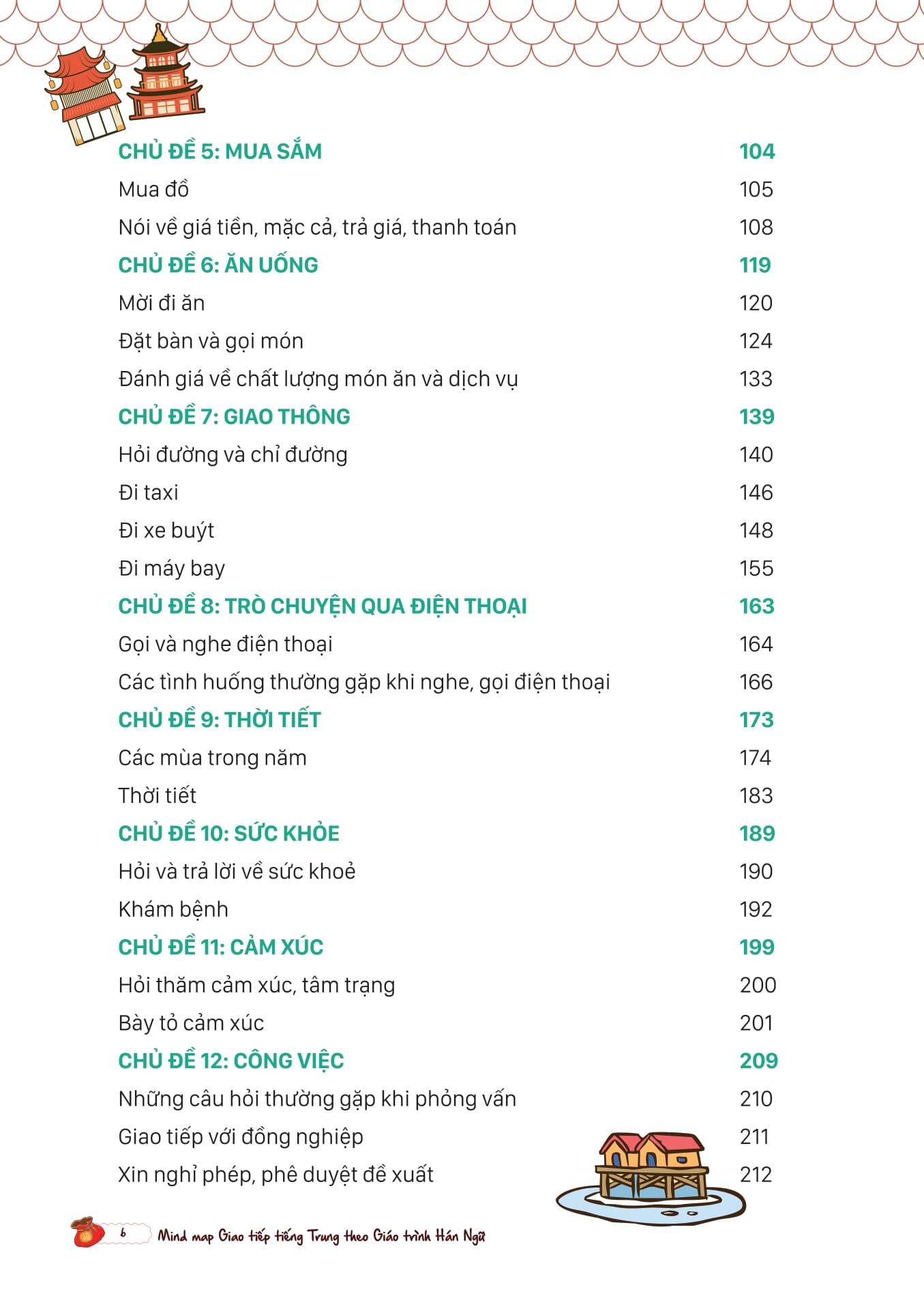 - Vốn từ vựng và ngữ pháp: Cung cấp một lượng từ vựng và ngữ pháp phong phú, giúp người học nắm vững ngữ pháp và sử dụng từ vựng chính xác trong giao tiếp Giáo trình Hán ngữ là bộ sách học tiếng Trung phổ biến và hiệu quả hàng đầu, nhưng nhiều người học vẫn gặp khó khăn trong việc ứng dụng kiến thức vào giao tiếp thực tế. Mind Map Giao Tiếp Tiếng Trung Theo Giáo Trình Hán Ngữ là cuốn sách do MCBooks phát hành giúp người học giải quyết vấn đề này. Cuốn sách sử dụng phương pháp sơ đồ tư duy (mind map) để hệ thống hóa các tình huống giao tiếp và từ vựng, giúp người học dễ dàng ghi nhớ và áp dụng kiến thức vào các cuộc trò chuyện hàng ngày. Nhờ đó, người học tự tin hơn khi sử dụng ngôn ngữ này trong cuộc sống. Nội dung chính trong sách Cuốn sách được chia thành các phần như sau: Bài mở đầu: Phát âm Phần này cung cấp nền tảng về cách phát âm tiếng Trung, bao gồm các thanh mẫu, vận mẫu, thanh điệu và quy tắc biến âm. Đây là bước đầu tiên và rất quan trọng giúp người học làm quen với âm điệu và cách phát âm chuẩn của tiếng Trung. 12 chủ đề thông dụng trong cuộc sống Mỗi chủ đề được chia thành các bài học nhỏ dựa trên các ngữ cảnh khác nhau, như: