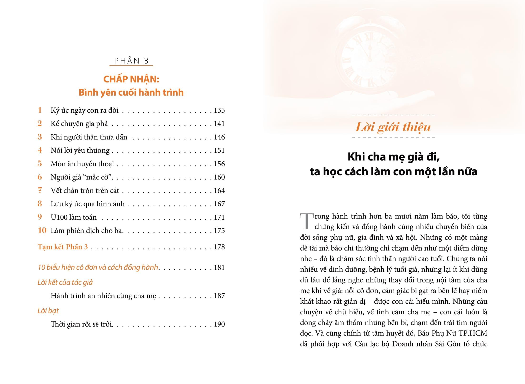 Đến một thời điểm, mọi nỗ lực níu giữ cần được thay thế bằng sự chấp nhận. Không phải buông xuôi, mà là bình thản đồng hành cùng cha mẹ qua đoạn cuối hành trình với tình yêu thương. Những câu chuyện ở phần này phản ánh giai đoạn sâu lắng, khi cả tác giả và cha học cách chấp nhận sự bào mòn của trí nhớ và hình ảnh người cha từng mạnh mẽ giờ đây trở nên mong manh.
