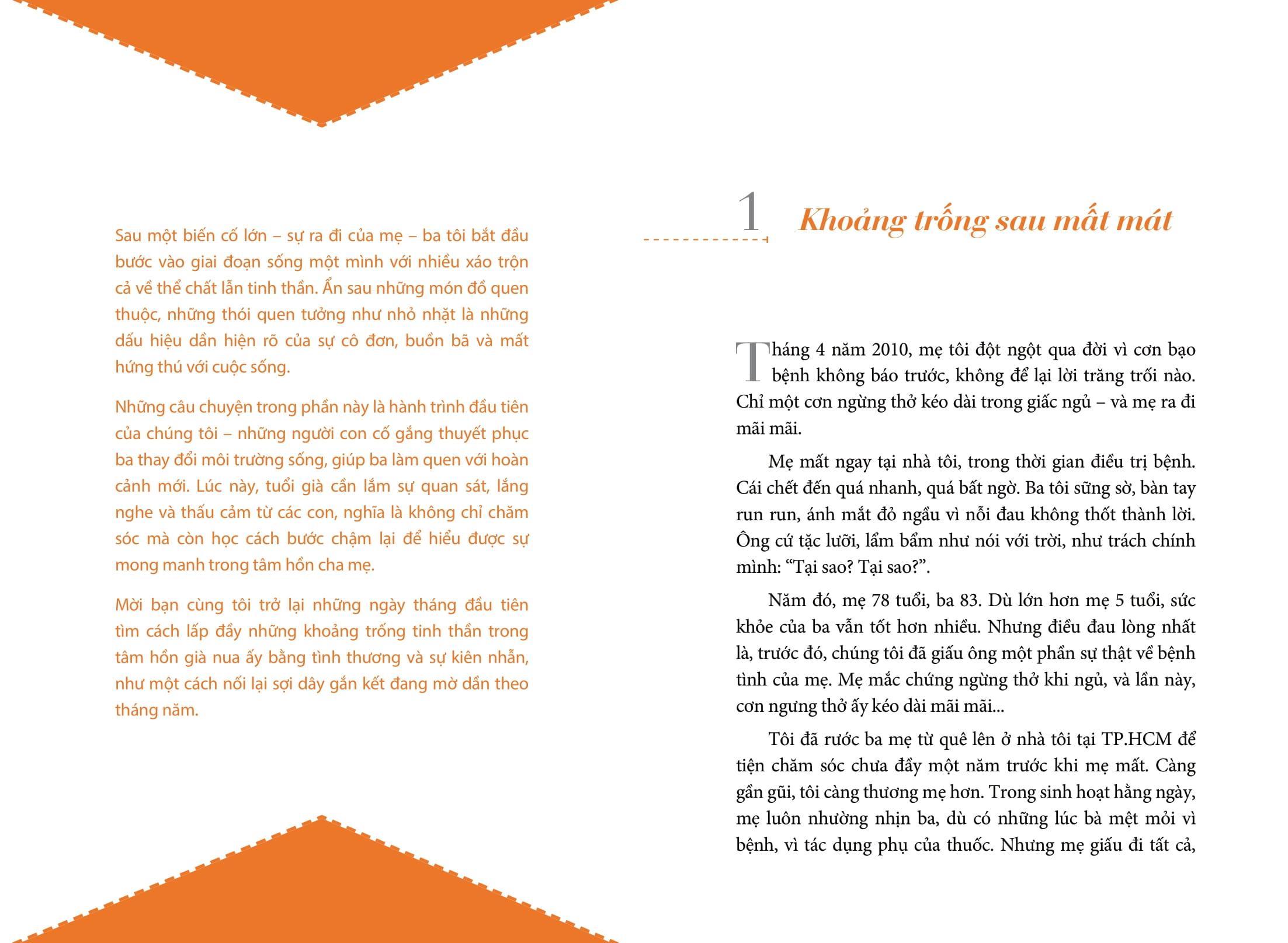 Sau sự ra đi của người mẹ, người cha bước vào hành trình sống một m.ình và ông bắt đầu đối diện với nhiều biến động cả về thể chất lẫn tinh thần. Ẩn sau những đồ vật quen thuộc và thói quen tưởng chừng nhỏ nhặt là những dấu hiệu ngày càng rõ rệt của sự cô đơn, buồn bã và sự mất hứng thú với cuộc sống. Những câu chuyện trong phần này khắc họa hành trình đầu tiên của tác giả cùng gia đình trong nỗ lực thuyết phục cha thay đổi môi trường sống, giúp ông thích nghi với hoàn cảnh mới. Qua những trang viết, tác giả tinh tế dẫn dắt người đọc khám phá các khía cạnh sâu sắc của mối quan hệ cha con, nơi không chỉ hiện diện nỗi đau mà còn là niềm vui, tiếng cười và những ký ức đẹp. Qua đó cho thấy việc chăm sóc người cao tuổi không chỉ đơn thuần là một nghĩa vụ, mà còn là một hành trình tràn đầy ý nghĩa và tình yêu thương. Sự hiện diện và lắng nghe được tác giả nhấn mạnh như những liều thuốc quý giá cho tâm hồn người cao tuổi.