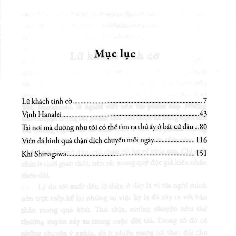 Thất lạc người thân, sinh ly tử biệt, lãng quên tên họ... Những con người đột nhiên đánh mất điều quý giá rồi sa chân vào một góc đô thị - một thế giới tràn đầy sự trùng hợp và bất ngờ. Lữ khách tình cờ đưa ta lần theo ánh sáng nhạt mờ trong trái tim người chỉnh đàn cô độc, Vịnh Hanalei họa nên cuộc sống của một người mẹ có đứa con trai bỏ mạng nơi biển cả xứ xa... Ở thế giới mà ta đã quen, có những điểm mù xuất hiện trong khoảnh khắc, số phận bí ẩn của những người mất hút vào những điểm mù ấy được thuật lại trong năm câu chuyện này.