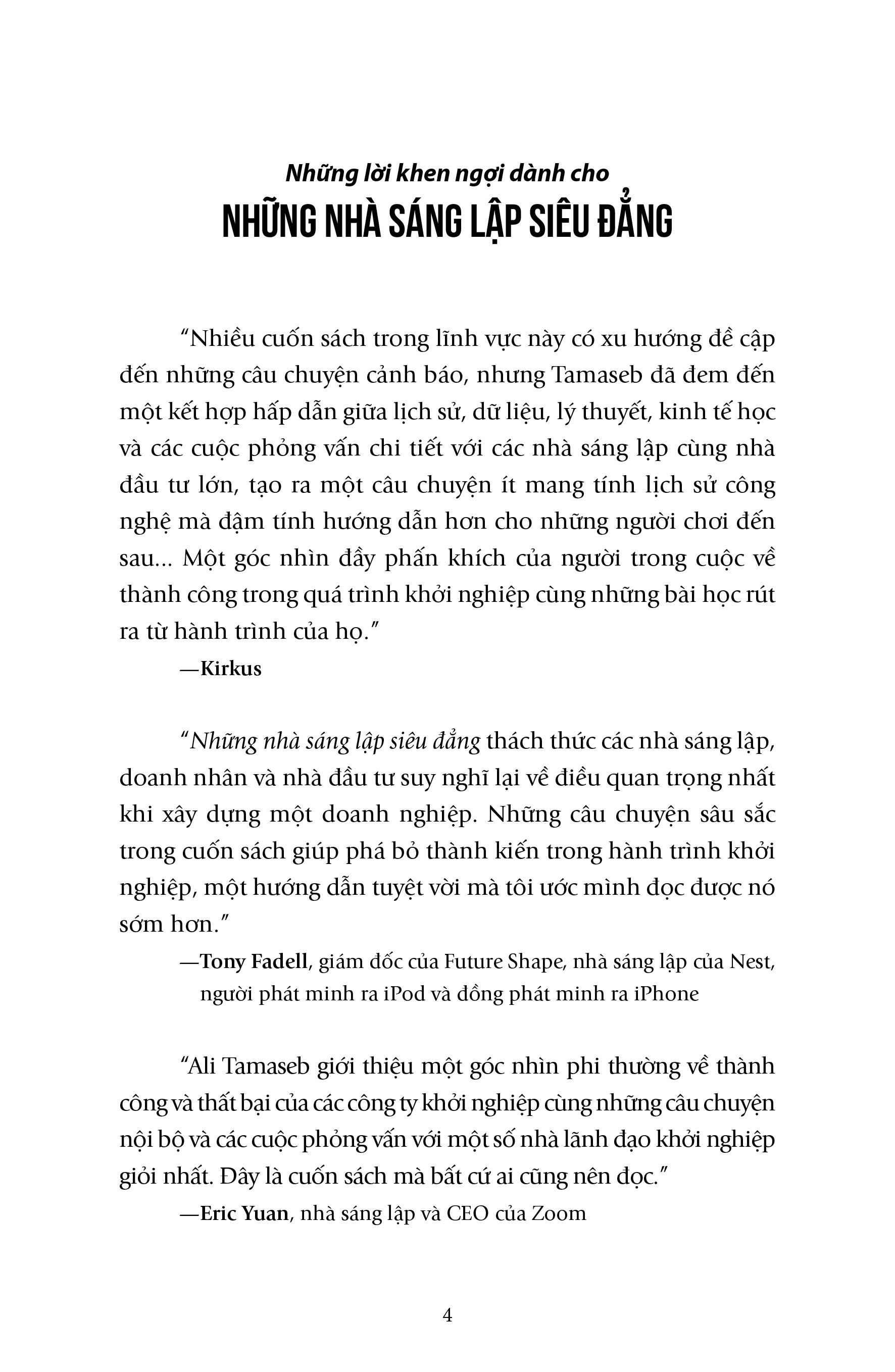 Ali Tamaseb chỉ tập trung phân tích các công ty kì lân (các công ty có trị giá hơn 1 tỉ đô la), dù những công ty này thu hút mọi sự chú ý của giới truyền thông nhưng thực chất lại không hề phổ biến: Các công ty kì lân chỉ chiếm ít hơn 0,1% trong tổng số các công ty khởi nghiệp. Cấu trúc của cuốn sách rất rõ ràng, giống như một cuốn giáo trình đại học. Phần đầu tiên được dành để giải nghĩa các hiểu lầm xung quanh các công ty khởi nghiệp và các nhà sáng lập của chúng. Tiếp đó là những câu chuyện của các công ty nổi tiếng cũng như những công ty kì lân ít nổi tiếng hơn nhưng giá trị không hề kém cạnh. Phần tiếp theo xoay quanh các mô hình kinh doanh, thời điểm để đưa sản phẩm ra mắt thị trường và cách để đối phó với sự cạnh tranh. Cuối cùng, tác giả đề cập đến một vấn đề hấp dẫn: Gọi vốn, phần này tập trung chủ yếu vào các quỹ đầu tư, các công ty đầu tư mạo hiểm cùng các nhà đầu tư thiên thần – chủ đề ít quen thuộc với các độc giả phổ thông.
