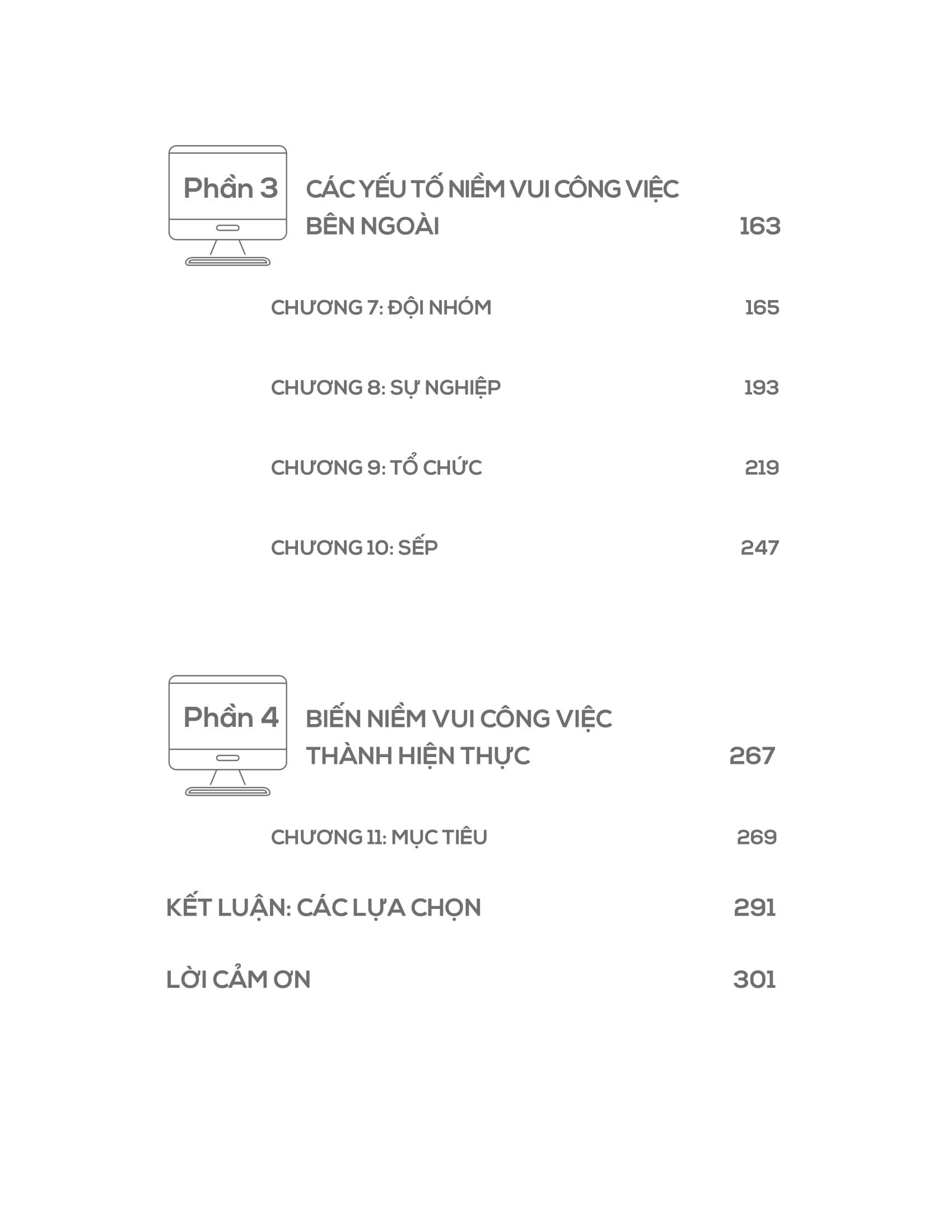- Làm sao để sử dụng bộ công cụ này hiệu quả và phù hợp đối với bản thân? "Niềm vui công việc" được chia thành 4 phần, bao gồm: Phần 1: Giới thiệu về Niềm vui công việc và Nỗi buồn công việc Phần 2: Các yếu tố Niềm vui Công việc nội tại Phần 3: Các yếu tố Niềm vui Công việc bên ngoài Phần 4: Biến Niềm vui Công việc thành hiện thực Với bộ công cụ hữu ích này, bạn có thể sử dụng theo hai cách: Bạn có thể đọc nó từ đầu đến cuối, bắt đầu với những kiến thức nền tảng và từng bước tìm hiểu những lời khuyên thiết thực - một trải nghiệm đắm chìm trọn vẹn! Bạn cũng có thể tập trung vào các phần phù hợp với nhu cầu của m.ình ngay lúc này, từ đó áp dụng vào thực tế một cách dễ dàng hơn. Với "Niềm vui công việc" - một bộ sưu tập các công cụ thực tế, được thiết kế để đưa người đọc vào một chuyến thám hiểm nhằm tìm kiếm và duy trì nhiều niềm vui hơn trong đời sống công việc của chính m.ình, bạn chắc chắn sẽ tìm thấy lại được chính m.ình, tạm biệt tình trạng "zombie" công sở, thắp lại ngọn lửa say mê và giúp cho tinh thần phấn chấn, năng động trở lại!