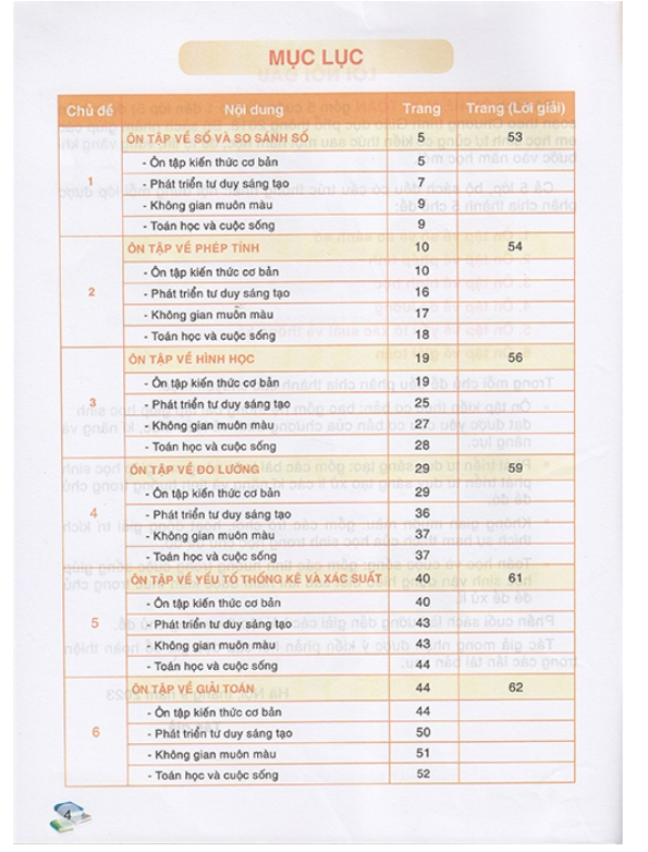 - Ôn tập về giải toán Trong mỗi chủ đề đều phân chia thành các chuyên mục: Ôn tập kiến thức cơ bản: bao gồm hệ thống bài tập giúp học sinh đạt được yêu cầu cơ bản của chương trình về kiến thức, kĩ năng và phẩm chất năng lực. Phát triển tư duy sáng tạo: gồm các bài toán nâng cao giúp học sinh phát triển tư duy sáng tạo để xử lí các kĩ năng và tình huống trong chủ đề đó. Không gian muôn màu: gồm các trò chơi, hoạt động giải trí kích thích sự ham thích của học sinh khi học chủ đề đó. Toán học và cuộc sống: gồm các tình huống trong cuộc sống giúp học sinh vận dụng hiểu biết sau khi nắm được kiến thức trong chủ đề để xử lí. Phần cuối sách là hướng dẫn giải các bài tập theo từng chủ đề.