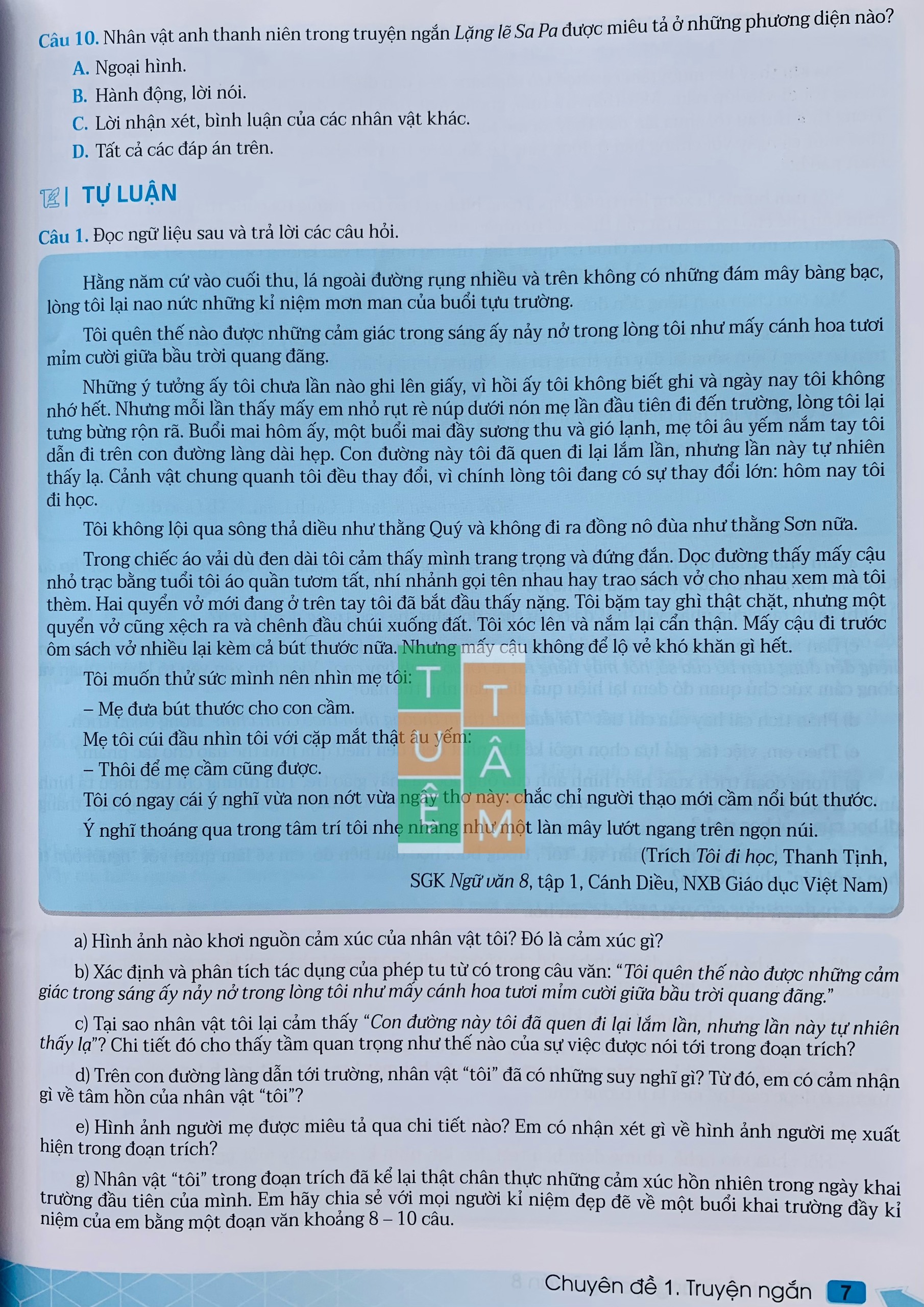 Thứ nhất, phần đọc gồm các bài tập trắc nghiệm và tự luận về các kiến thức văn bản, tiếng Việt.