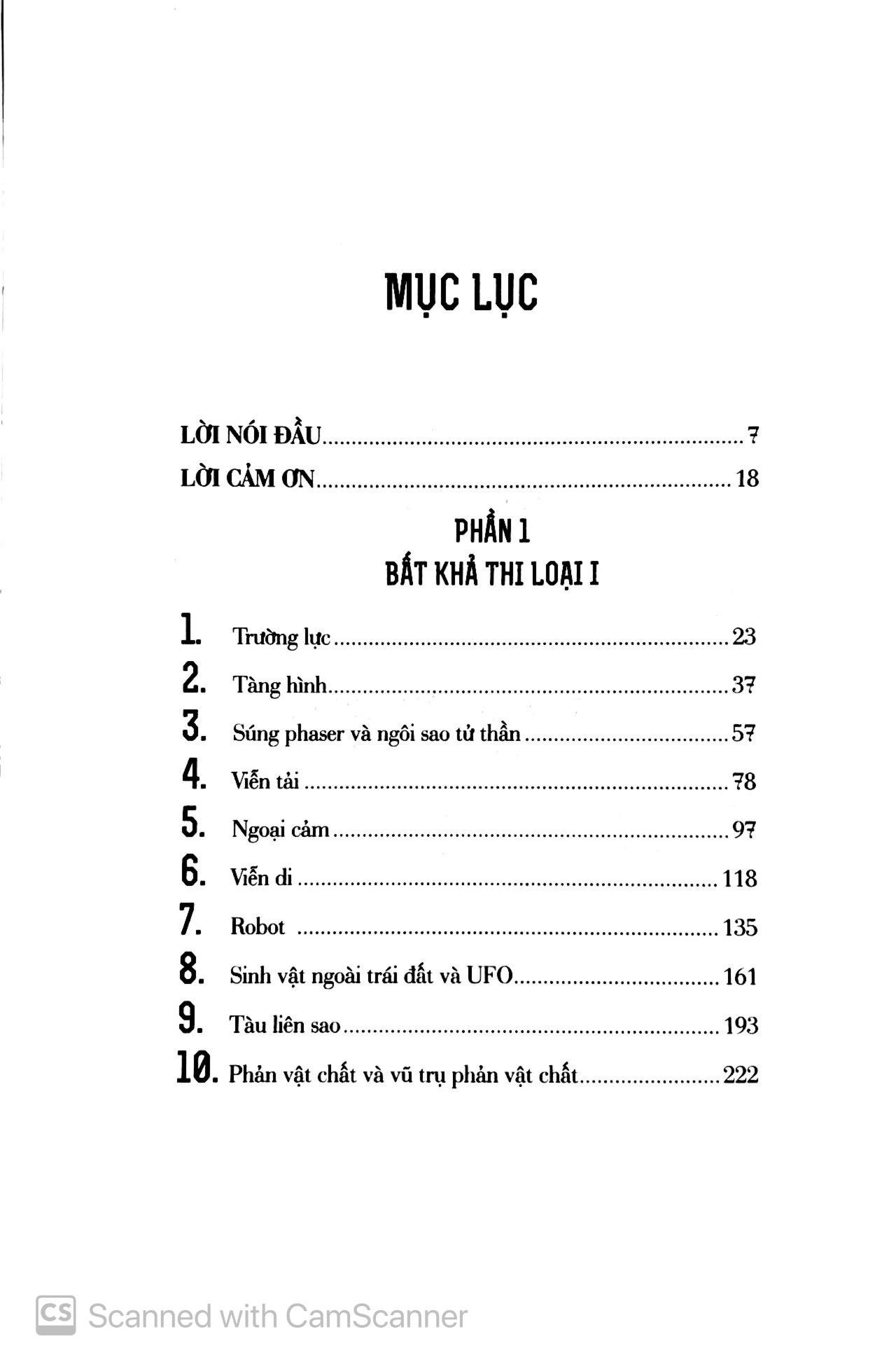 Bằng lối dẫn chuyện lôi cuốn và khơi gợi trí tò mò, Kaku đưa chúng ta theo một hành trình khó quên đầy mê hoặc của các chùm tia hủy diệt, trường lực, áo khoác tàng hình đến du hành thời gian… Dù phải chờ thêm hàng thế kỷ hay khả thi ngay trong vài thập kỷ tới, hẳn bạn sẽ bất ngờ khi biết những điều ngỡ “viễn tưởng” này, thật ra, lại trong tầm với của khoa học.