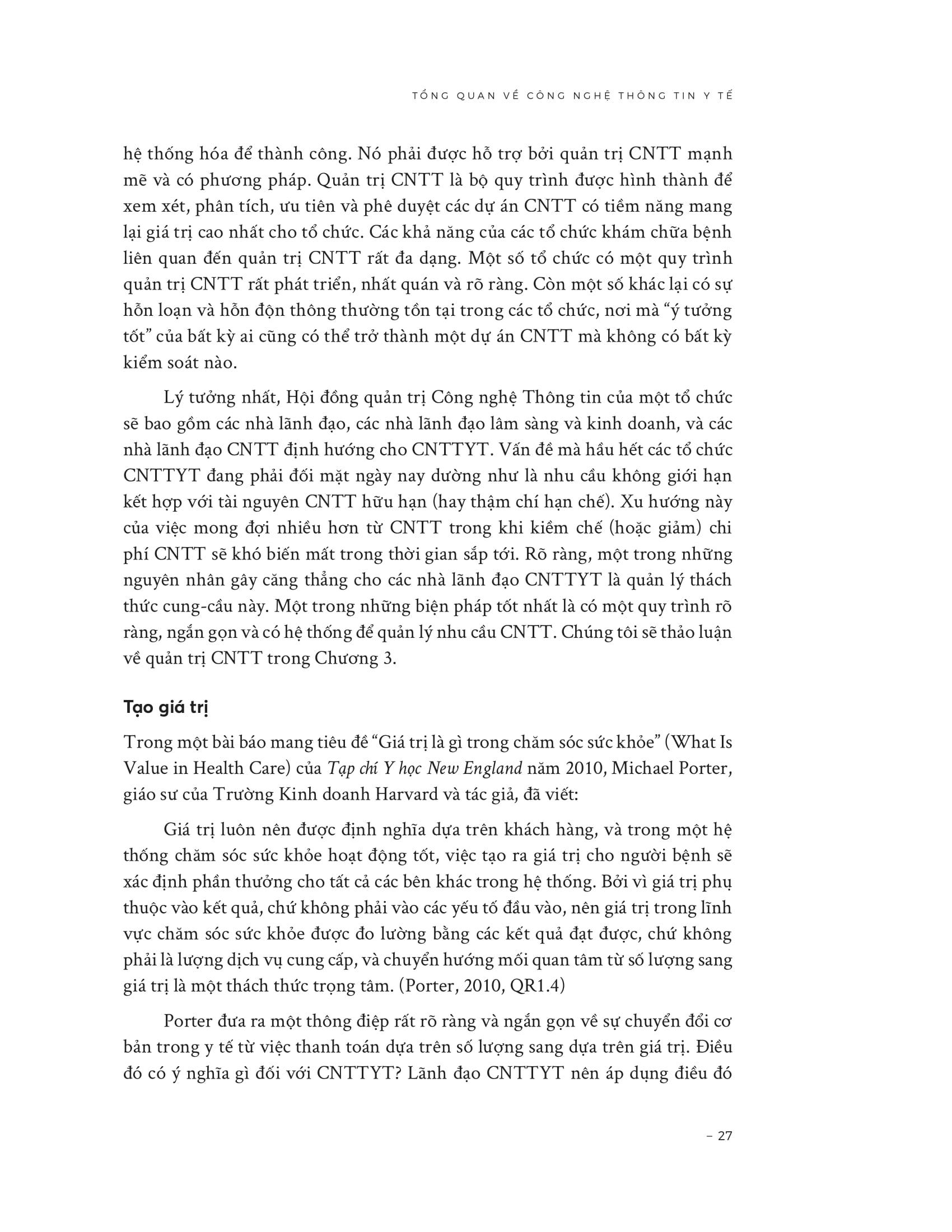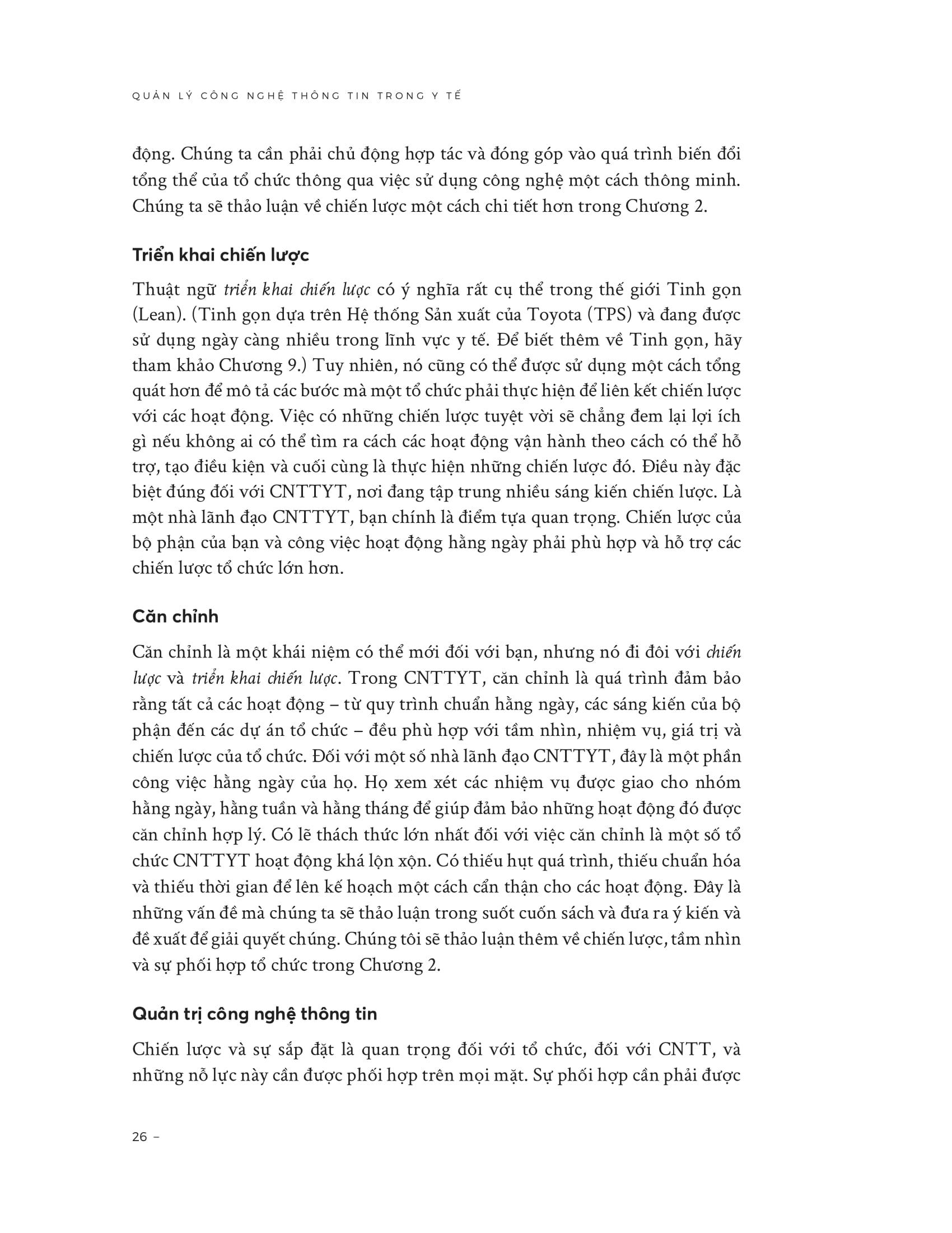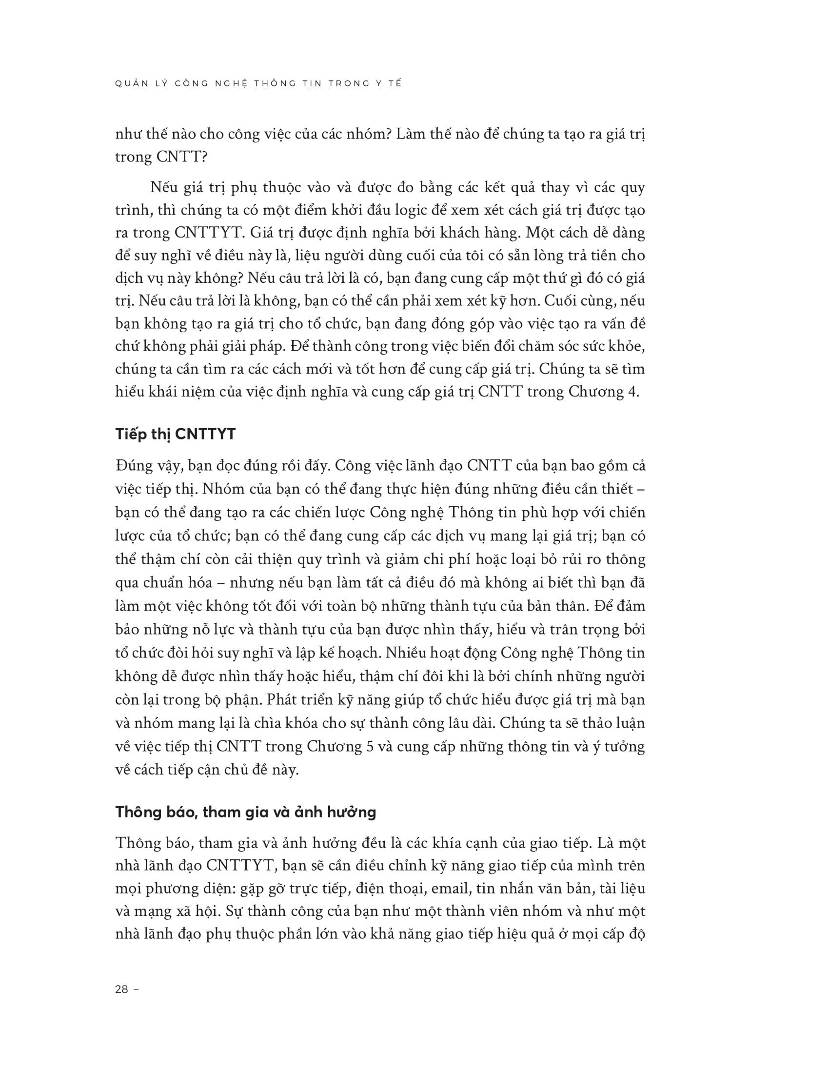 Mua tại TiktokQuản Lý Công Nghệ Thông Tin Trong Y Tế - Chiến Lược, Tầm Nhìn Và Kỹ Năng Trong bối cảnh y tế ngày càng số hóa, công nghệ thông tin y tế (CNTTYT) giữ vai trò trung tâm của hệ thống vận hành. Cuốn sách này là một cẩm nang thực hành cho lãnh đạo CNTT trong ngành y, tập trung không chỉ vào công nghệ mà còn vào kỹ năng lãnh đạo, quản trị và định hướng chiến lược. Tác phẩm bao quát từ nền tảng (chiến lược, quản trị CNTT, tạo giá trị, tiếp thị CNTT y tế) đến các chủ đề nâng cao (quản lý rủi ro, lãnh đạo, Lean IT, đổi mới, y tế số). Đây không chỉ là lý thuyết mà còn cung cấp các khung thực hành, công cụ, kỹ thuật, và case study thực tế để giúp nhà quản lý y tế và CNTT: