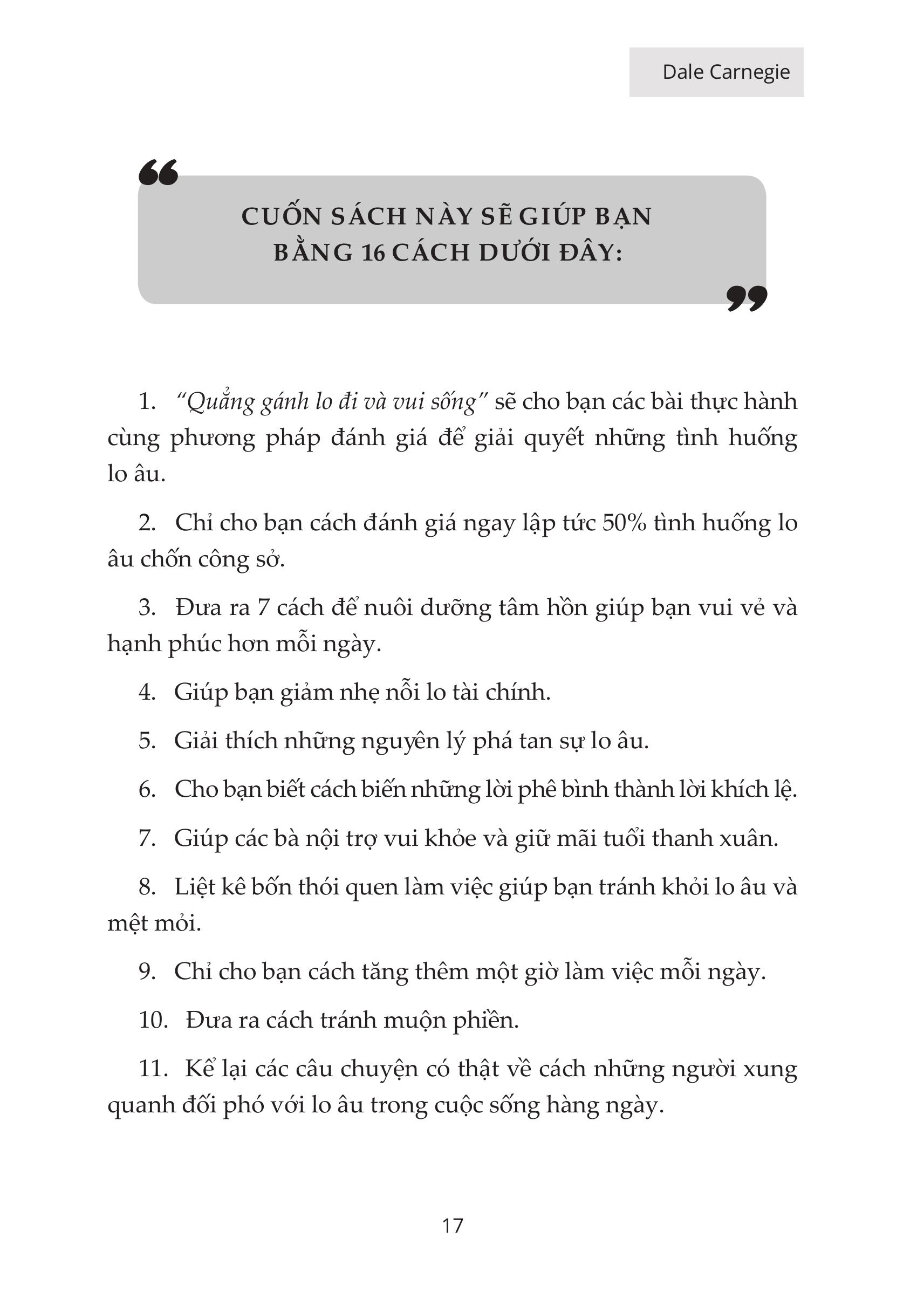 - Số trang: 260 GIỚI THIỆU SÁCH Sau Đắc Nhân Tâm thì Quẳng gánh lo đi và vi sống (How to Stop Worrying and start living) là một trong những cuốn sách bán chạy nhất trên thế giới. Bất kỳ ai đang sống đều sẽ có những lo lắng thường trực về học hành, công việc, những hoá đơn, chuyện nhà cửa,... Cuộc sống không dễ dàng giải thoát bạn khỏi căng thẳng, ngược lại, nếu quá lo lắng, bạn có thể mắc bệnh trầm cảm. Quẳng Gánh Lo Đi Và Vui Sống khuyên bạn hãy khóa chặt dĩ vãng và tương lai lại để sống trong cái phòng kín mít của ngày hôm nay. Mọi vấn đề đều có thể được giải quyết, chỉ cần bạn bình tĩnh và xác định đúng hành động cần làm vào đúng thời điểm. Cuốn sách được viết ra bởi người tự nhận mình là "một trong những kẻ bất hạnh nhất New York " nhưng chỉ sau một thời gian ngắn bằng những nỗ lực vượt bậc của mình, ông đã trở thành 1 người xuất trúng được hàng triệu người biết đến. Cuốn sách là tập hợp các quy tắc giúp bạn giải quyết những cảm xúc tiêu cực, lo lắng và buồn bã. Không chỉ đưa được người đọc đến một cuộc sống thú vị và trọn vẹn hơn mà còn giúp chúng ta nhận thức rõ về bản thân và cả những người xung quanh SƠ LƯỢC VỀ NỘI DUNG Cuốn sách bao gồm 10 phần khác nhau, với rất nhiều những kinh nghiệm và các lời khuyên từ tác giả cũng như những người đi trước, giúp bạn có thể nhận thức được những điều đúng đắn nhất. Chi tiết