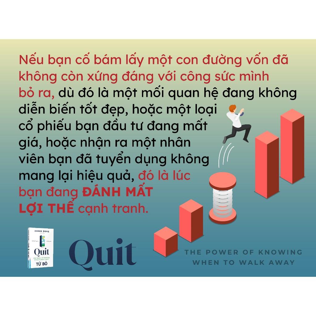 Tuy nhiên, Annie Duke – tác giả, diễn giả, nhà tư vấn trong lĩnh vực ra quyết định và là Tiến sĩ về Tâm lý học Nhận thức – đã lật ngược những niềm tin phổ biến này thông qua cuốn sách “Từ bỏ” (tựa gốc: Quit). Cô cho rằng thành công không nằm ở việc bám chặt lấy mục tiêu mà nằm ở việc xác định mục tiêu đáng theo đuổi và biết từ bỏ những thứ không còn phục vụ cho hạnh phúc lâu dài của mình.