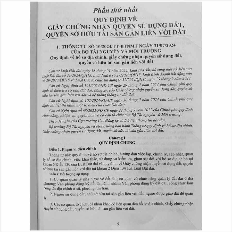 – Thông tư 10/2024/TT-BTNMT ngày 31/07/2024 Quy định về hồ sơ địa chính, giấy chứng nhận quyền sử dụng đất, quyền sở hữu tài sản gắn liền với đất,