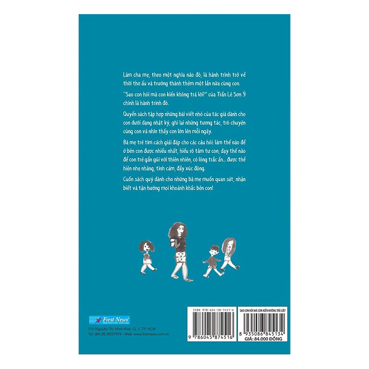 Nếu nói cha mẹ là người thầy đầu tiên của con thì theo một nghĩa nào đó, con trẻ cũng chính là những người thầy của các bậc cha mẹ. Từ con trẻ, ta học được sự hồn nhiên, giản đơn, bao dung cùng tình yêu vô điều kiện – những điều mà ta đã đánh mất trong quá trình trưởng thành. Đọc Sao con hỏi mà con kiến không trả lời?, đọng lại trong ta là sự trong trẻo của Bột – Gạo – Nếp, là những tâm sự, trở trăn của một bà mẹ trẻ hiện đại và điển hình. Ta cũng học được không ít bài học để biết cách đồng hành cùng con trên mỗi bước trưởng thành. Trên hết, mỗi trang sách là một lời nhắc nhở rất khẽ để ta ghi nhớ rằng, “tuổi thơ con trôi qua rất nhanh”, nên hãy chầm chậm thôi, khi ở bên con và tận hưởng đi, những tháng ngày con thơ bé…!. Sách do thực hiện, NXB Tổng Hợp Thành Phố ấn hành.