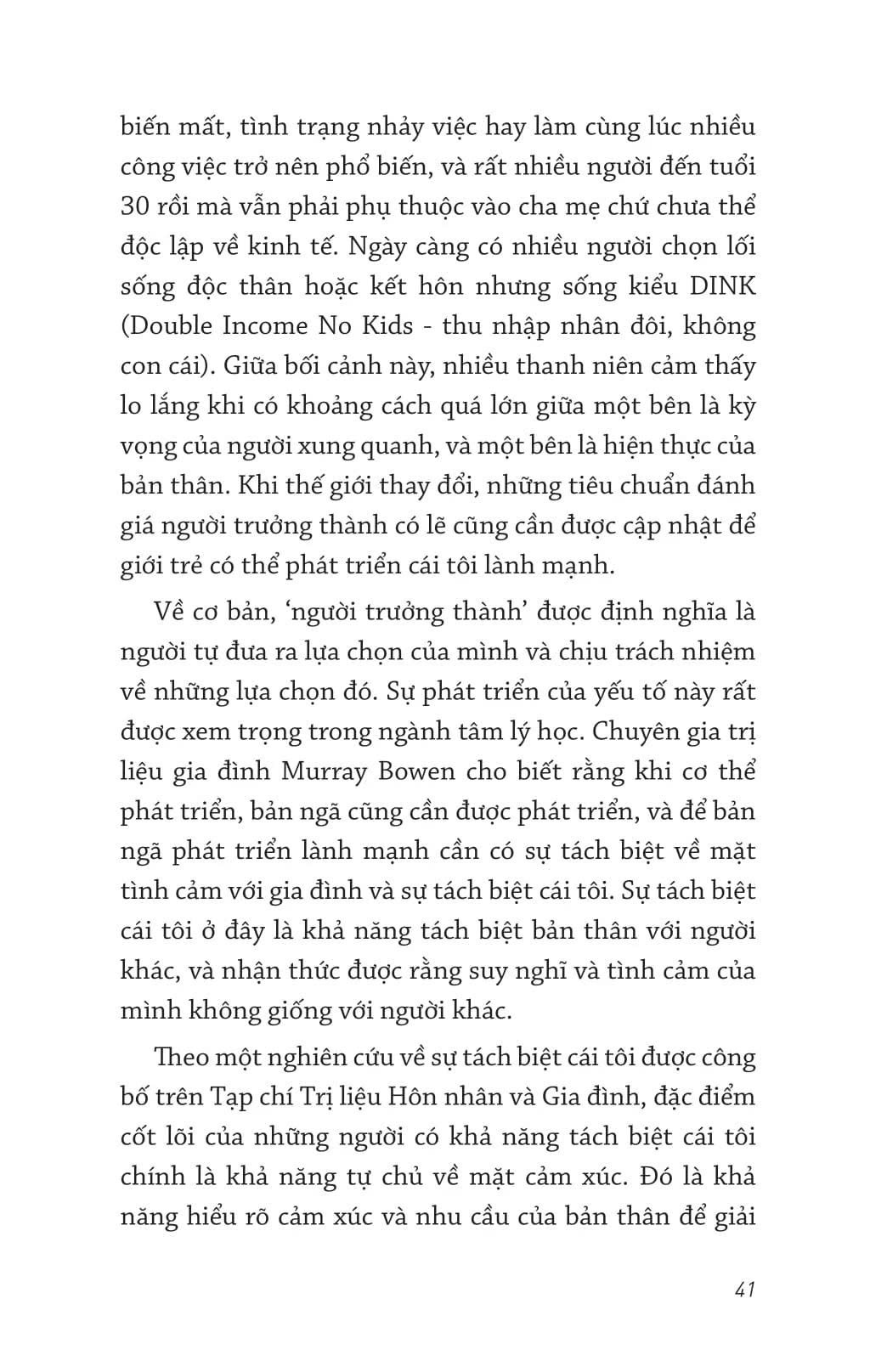 Tuổi 30 ngày nay không còn giống tuổi 30 ngày xưa. Đến tuổi này, nếu bạn vẫn chưa ổn định về kinh tế hay về tinh thần thì bạn sẽ vẫn như thuở 20, đầy hoang mang và mơ hồ trước cuộc đời. Tác giả cũng từng trải qua giai đoạn cô đơn và lạc lối như thế. Nhưng nhờ được học ngành tâm lý học mà cô hiểu được nguyên nhân khiến tâm trí bấn loạn không đến từ môi trường bên ngoài hay từ những người xung quanh, mà chính là do cảm giác xa lạ với chính mình. Chỉ sau khi cô đọc vị những cảm xúc ẩn giấu sâu bên trong và gần gũi hơn với nội tâm thì cô mới cải thiện được mối quan hệ với bản thân, với người khác, và thậm chí cả công việc mình đang làm.