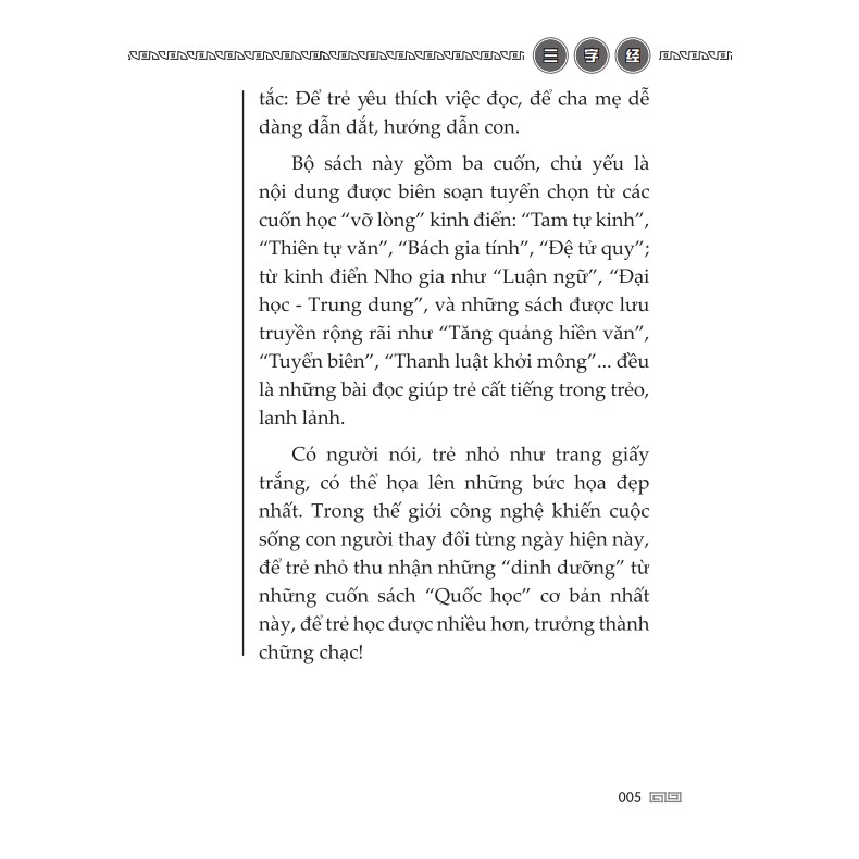 Tác giả: Vương Ứng Lân (đời Tống) Giá bìa: 100.000 ₫ NXB: NXB Dân Trí Phát hành: Minh Thắng Năm xuất bản: 2019 Dịch giả: Phạm Hồng Dạng bìa: bìa mềm Số trang: 300 trang Kích thước: 14,5 x 20,5 cm --------------Giới thiệu sách------------- Đệ tử quy, Tam tự kinh, Thiên tự văn là giáo trình cơ sở khai mở đạo đức truyền thống Trung Hoa. Ba bộ sách này hợp lại thường được gọi chung là Đệ Tam Thiên (cũng gọi là“Thần thánh Đệ tử quy” hay “Thần thánh Thiên tự văn”). “Đệ tử quy”, được ca ngợi là “Nhân sinh đệ nhất bộ, thiên hạ đệ nhất quy”, do Lý Dục Tú biên soạn vào những năm Khang Hy đời Thanh, giảng đạo đức luân lý và lễ tiết cơ bản, quy phạm hành vi chính xác của trẻ. “Tam tự kinh” do Vương Ứng Lân đời Tống biên soạn, được bổ sung, hoàn thiện vào đời Minh, Thanh. Sách được biên soạn để dạy vỡ lòng cho trẻ, nhấn mạnh cần phải chuyên cần, chăm chỉ học tập, trau dồi kiến thức để duy trì bản tính thiện. “Thiên tự văn” do Chu Hưng Tự đời Lương thời Nam Triều, thụ hoàng mệnh Lương Vũ Đế biên soạn. Đây là bộ sách xuất sắc nhất trong các kinh điển giáo dục trẻ em truyền thống của Trung Hoa với câu văn tự nhiên như lời nói, dễ đọc dễ nhớ, là cuốn sách vỡ lòng dành cho trẻ. Chúng tôi hy vọng rằng, những cuốn sách quý này sẽ đồng hành cùng các gia đình trên con đường giáo dục trẻ thành công, tìm về những giá trị đạo đức truyền thống tốt đẹp, đạt tới nhân sinh hạnh phúc mỹ mãn.