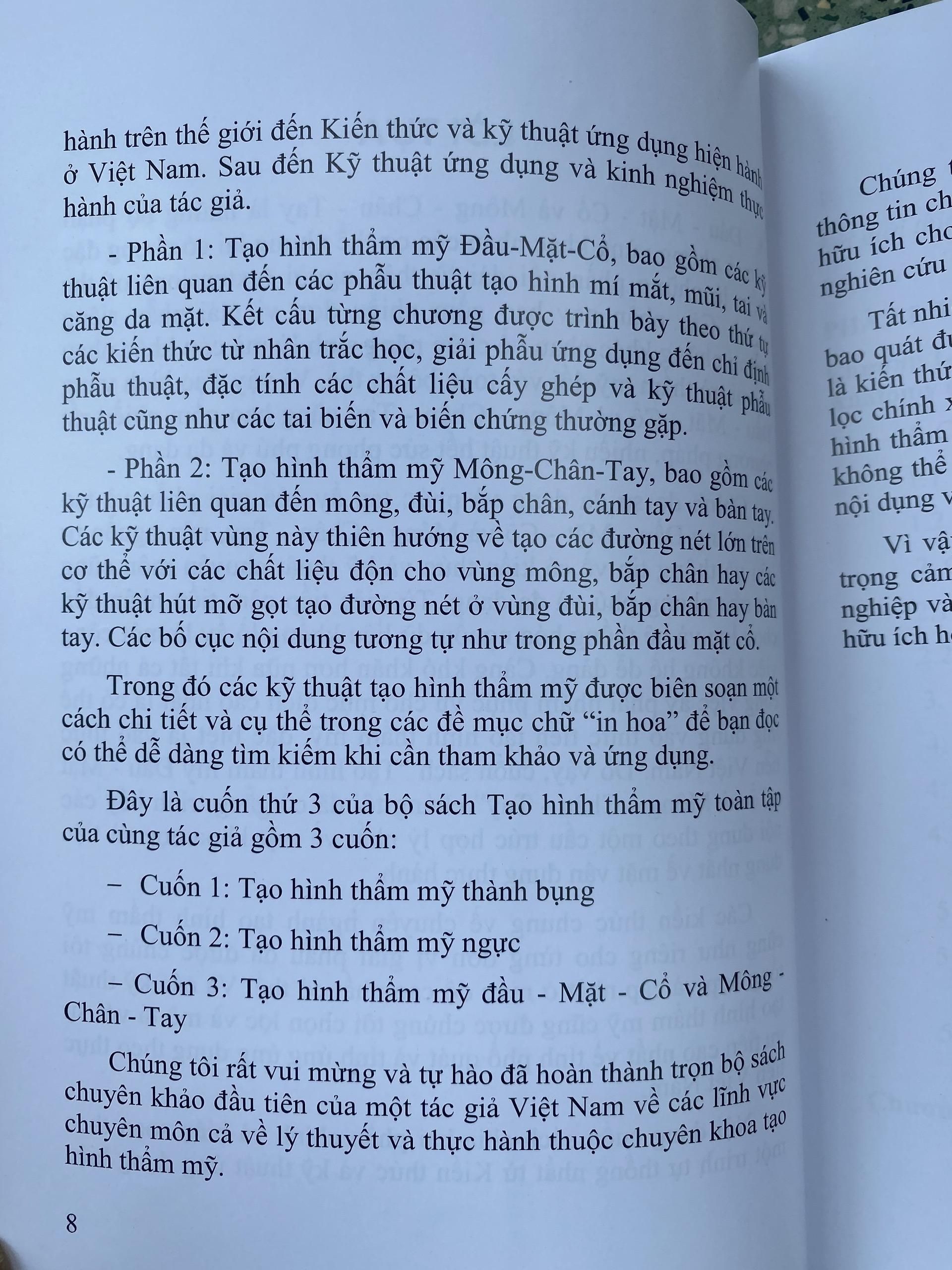 Cuốn sách được biên soạn công phu với các kiến thức chung về chuyên ngành tạo hình thẩm mỹ cũng như riêng từng đơn vị giải phẫu. Các kỹ thuật tạo hình thẩm mỹ cũng được chọn lọc và mô tả với sự ưu tiên cao nhất về tính phổ quát và tính ứng dụng theo thực tiễn Việt Nam.