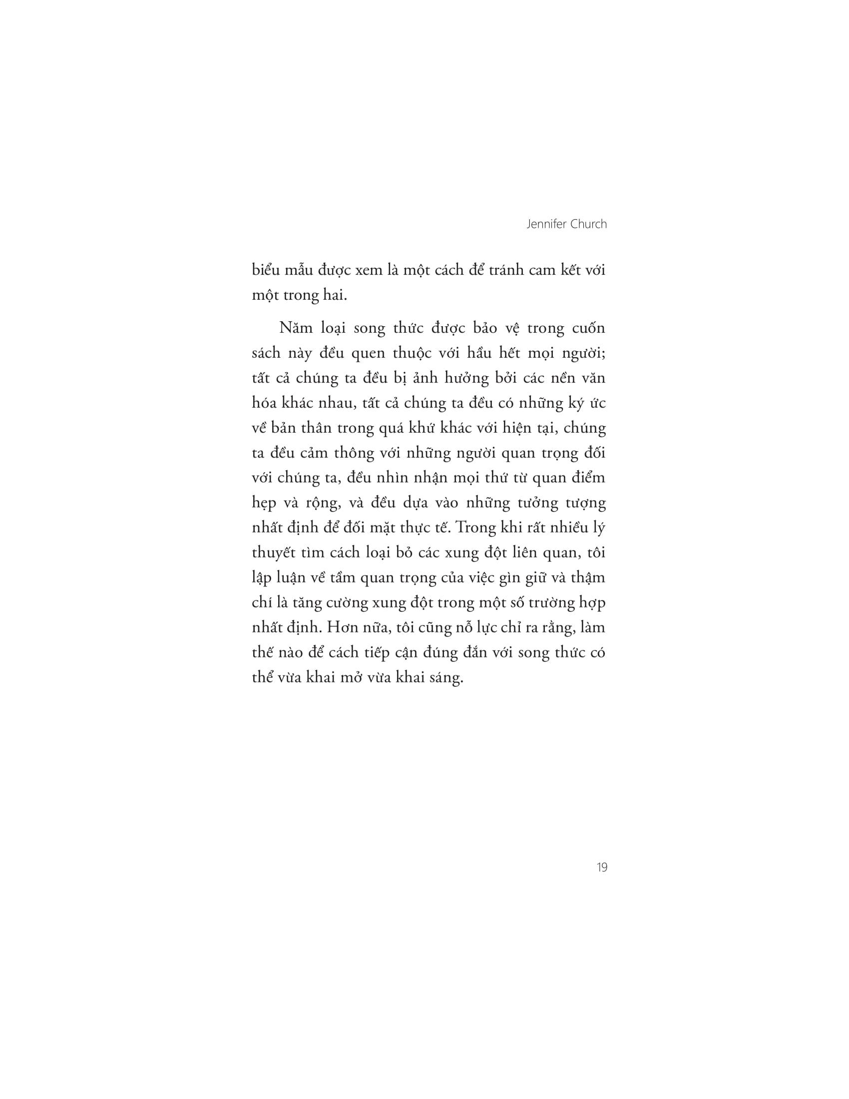 Tuy nhiên, trong cuốn sách “Thấu hiểu mâu thuẫn nội tâm” – tác giả Jennifer Church lập luận: Mâu thuẫn nội tâm có thể là một điều tốt, giúp chúng ta tự phản ánh và hiểu rõ hơn về bản thân, giá trị và niềm tin của m.ình. Cuốn sách này mô tả một vài kiểu mẫu của “song thức” hay “ý chí kép” và giải thích làm thế nào để trạng thái này được duy trì.