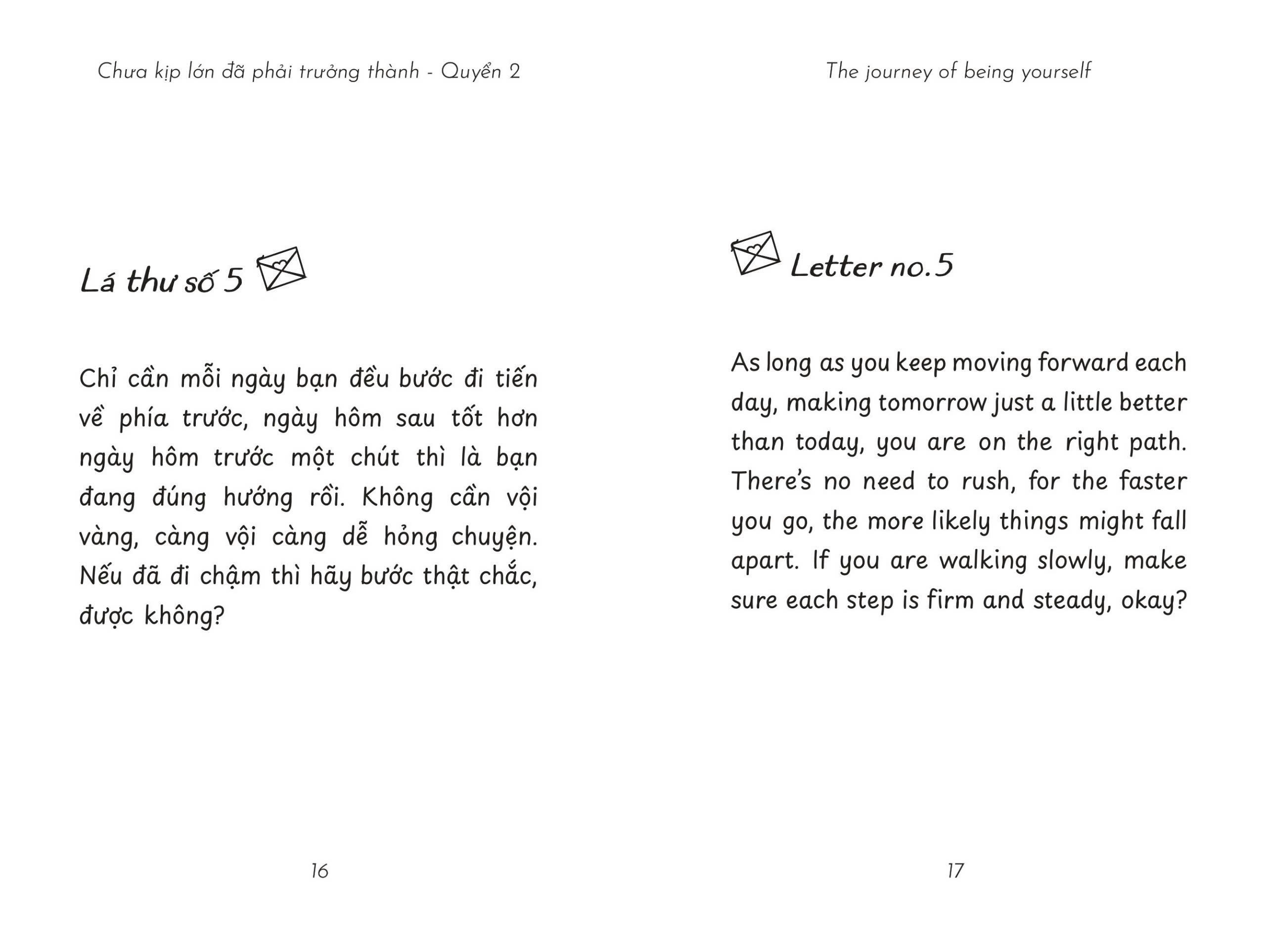 Cuốn sách là những lá thư tâm tình nhẹ nhàng được viết bằng 2 ngôn ngữ Việt - Anh sẽ nhắn nhủ bạn về sự đặc biệt của bản thân, tiếp thêm niềm tin để bạn không ngừng hoàn thiện trong thế giới người lớn, đồng thời nâng cao năng lực ngoại ngữ để chinh phục