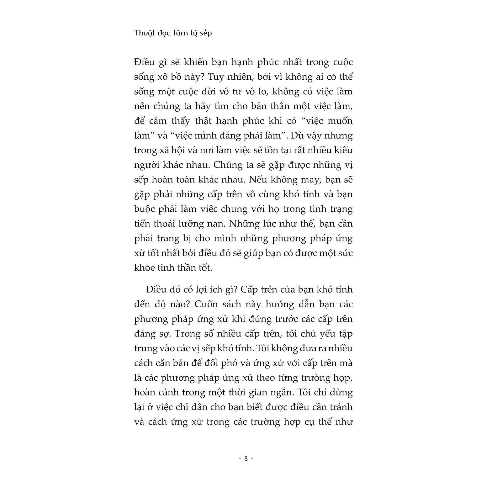 “Thuật đọc tâm lý sếp”sẽ là tài liệu bổ ích giúp bạn đọc có cài nhìn nhiều chiều hơn về môi trường công sở để từ đó trang bị cho bản thân những kiến thức và kỹ năng cần thiết.
