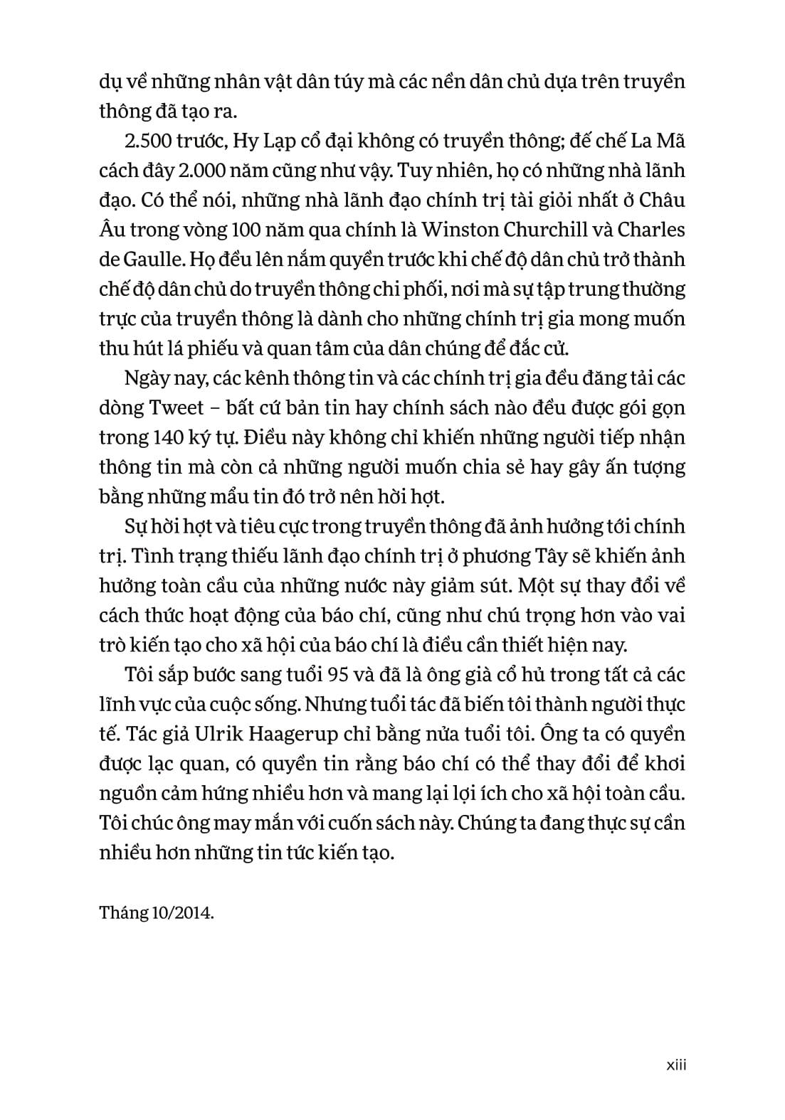 Cuốn sách có ích cho một CÁCH LÀM TRUYỀN THÔNG MỚI, khi truyền thông dễ dàng tràn ngập "tin xấu" (negative) và sự lên ngôi của chủ nghĩa dân tuý (populism) dần dà tạo nên mối hoài nghi ngày càng lớn trong dư luận.