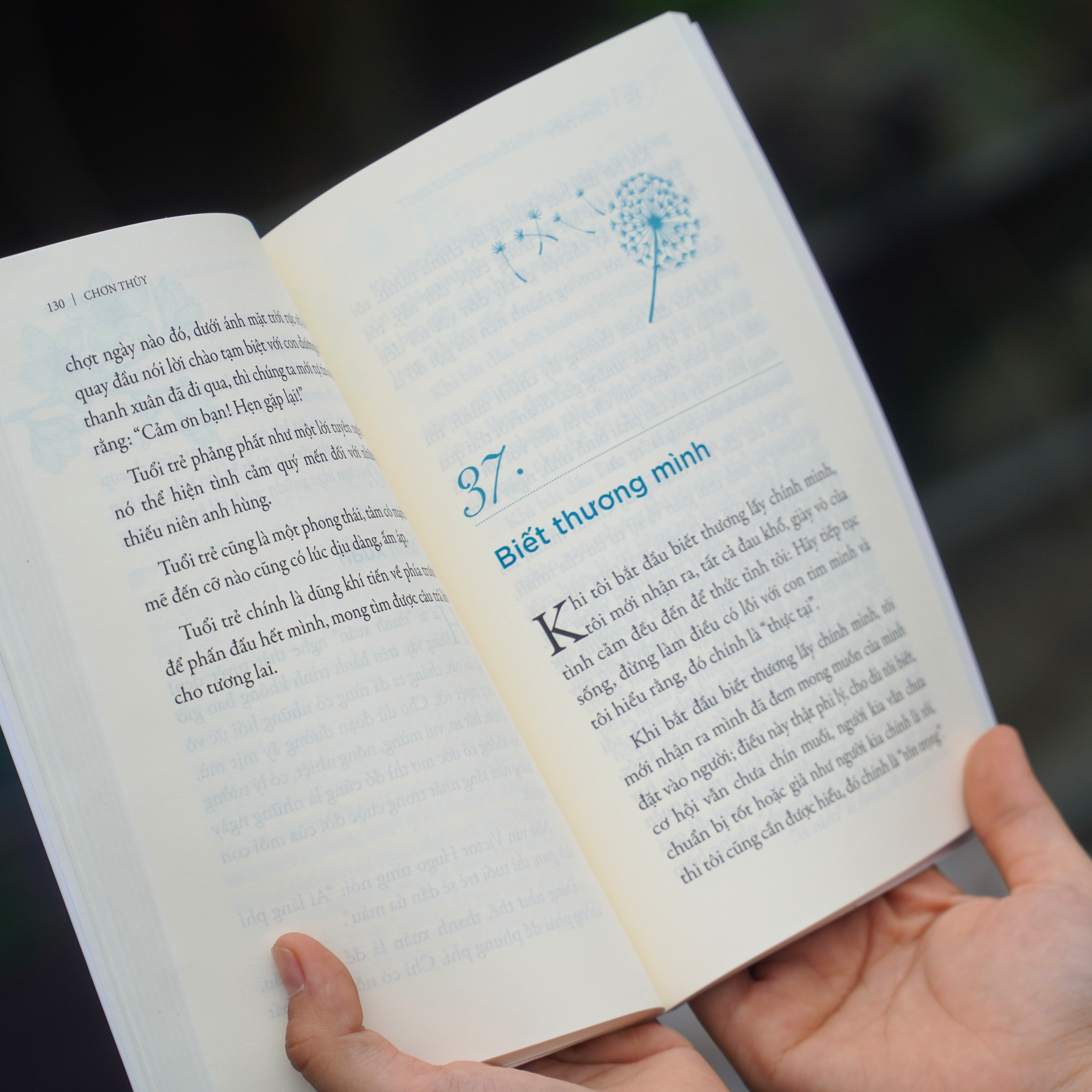 Tình thương là gia vị cần thiết để gắn kết con người với nhau, và cũng là vốn liếng đầu tiên mà con người có được khi đến với trần gian. Biết vậy, chúng ta còn chần chừ gì mà không đơm mầm hạt giống yêu thương đó! Gập cuốn sách lại, trong trái tim tôi, Tình thương mở lớn con đường, vẫn luôn sáng như tấm bản đồ để bản thân có thể tựa vào đồng hành trên hành trình bước tiến về phía trước.