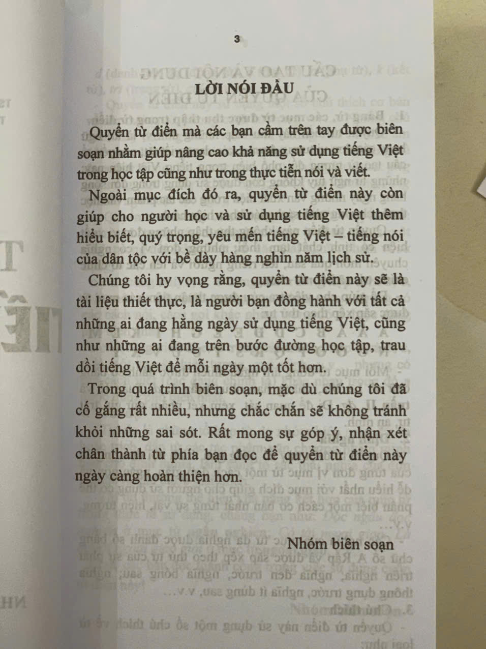 Chúng tôi hi vọng rằng cuốn từ điển này sẽ là tài liệu thiết thực, là người bạn đồng hành với tất cả những ai đang hằng ngày sử dụng tiếng Việt, cũng như với những ai đang trên đường học tập, trau dồi tiếng Việt mỗi ngày một tốt hơn.
