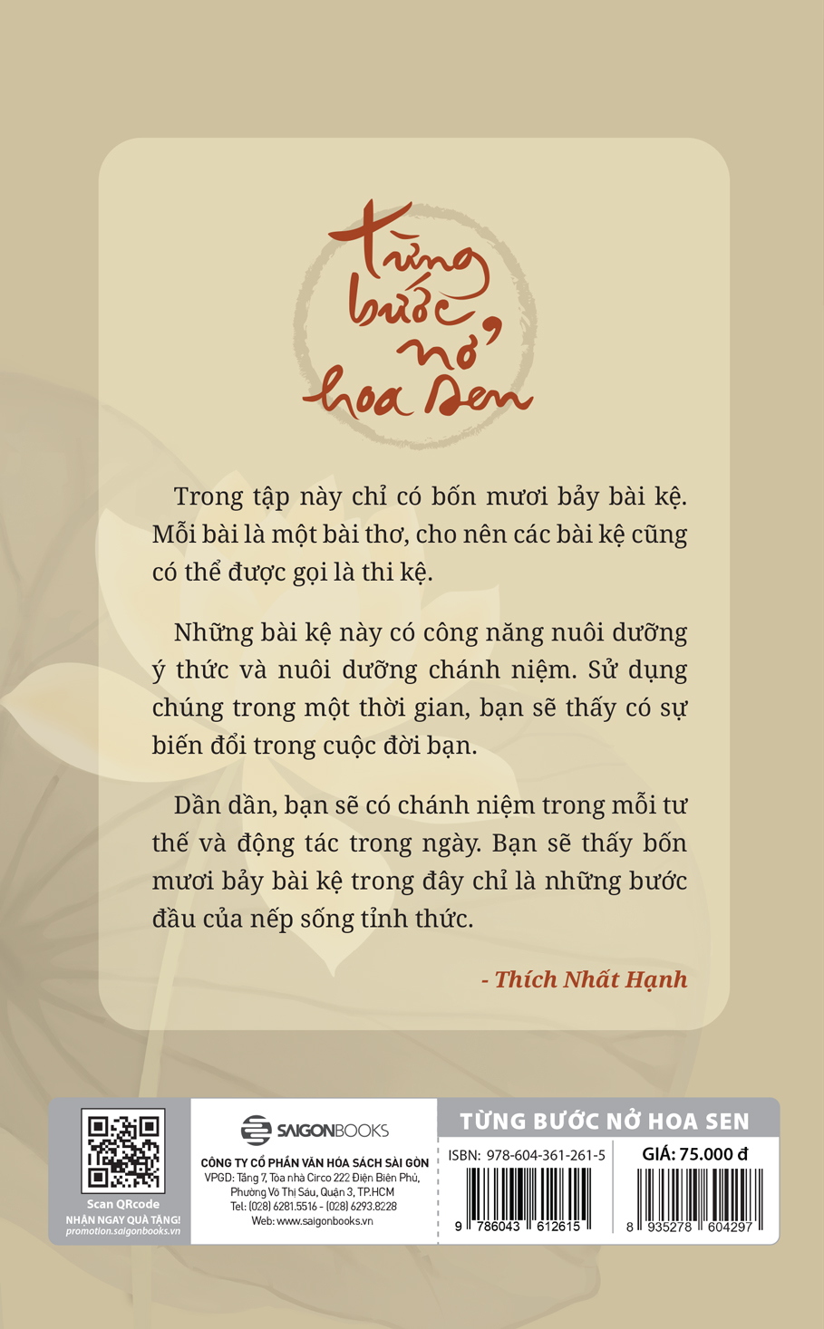 Từng bước nở hoa sen của Thiền sư Thích Nhất Hạnh là một trong những quyển sách "dạy" ta cách sống an nhiên như thế. Bốn mươi bảy bài kệ trong sách cũng là bốn mươi bảy bài học giúp ta tu tập chánh niệm mỗi ngày, hướng đến sự an lạc trong cả tâm, thân và sống hết mình cho từng giây phút hiện tại.