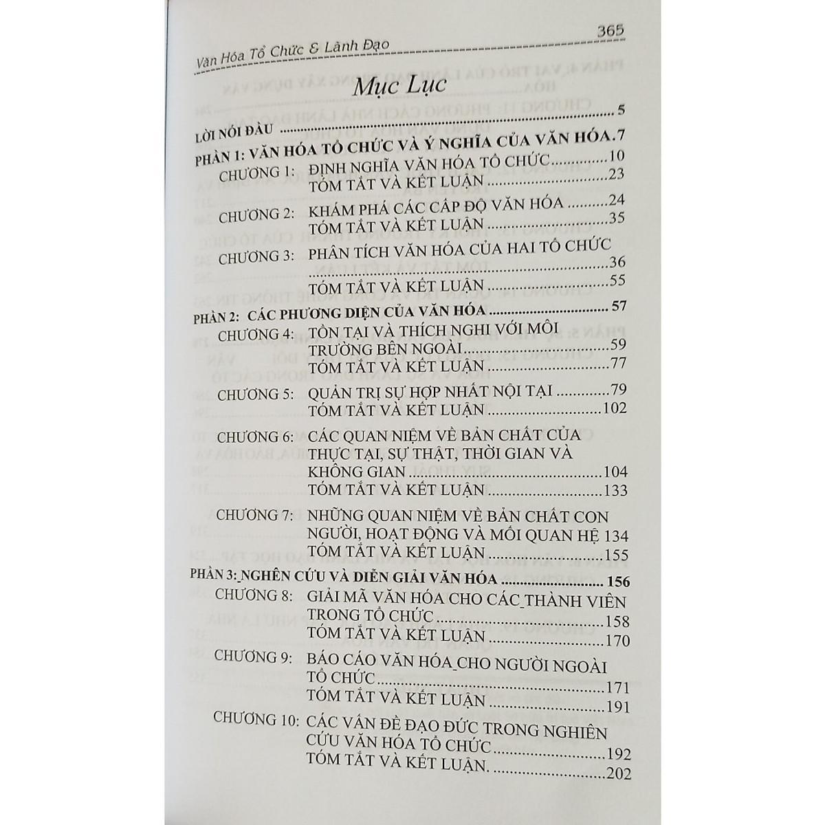 Cuốn sách "Văn Hóa Tổ Chức và Lãnh t Đạo" đề cập đến những vấn đề về bản chất của văn hóa tổ chức, cách thức giải mã văn hóa tổ chức, các phương diện văn hóa cũng như sự hìn thành và thay đổi văn hóa tổ chức. Đặc biệt những nội dung của văn hóa tổ chức luôn được trình bày gắn liền với vai trò và chức năng lãnh đạo trong hoạt động hình thành, định hướng và phát triển tổ chức trong môi trường bất ổn và hỗn loạn như hiện nay.