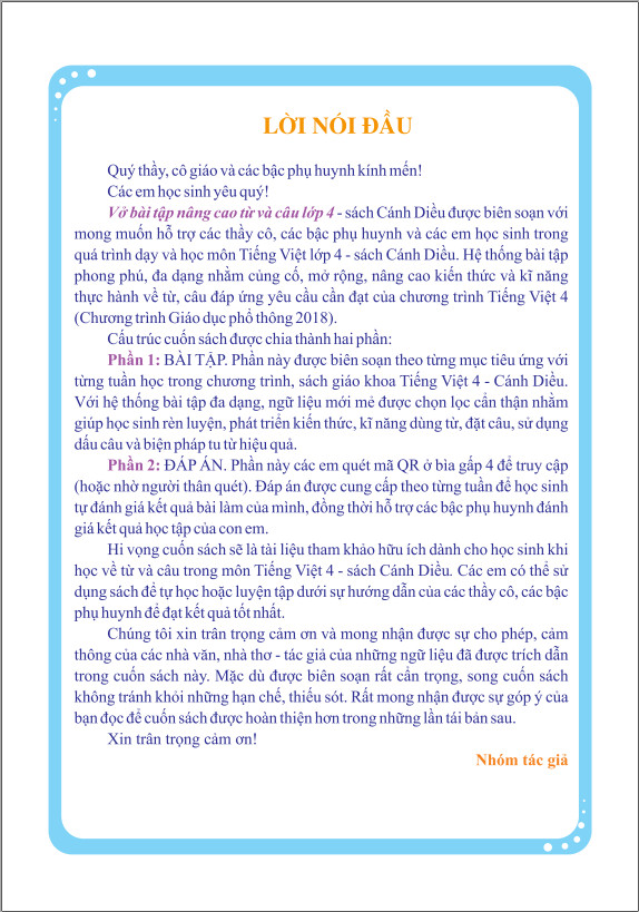 Vở bài tập nâng cao từ và câu lớp 4 - sách Cánh Diều được biên soạn với mong muốn hỗ trợ các thầy cô, các bậc phụ huynh và các em học sinh trong quá trình dạy và học môn Tiếng Việt lớp 4 - sách Cánh Diều. Hệ thống bài tập phong phú, đa dạng nhằm củng cố, mở rộng, nâng cao kiến thức và kĩ năng thực hành về từ, câu đáp ứng yêu cầu cần đạt của chương trình Tiếng Việt 4 (Chương trình Giáo dục phổ thông 2018).