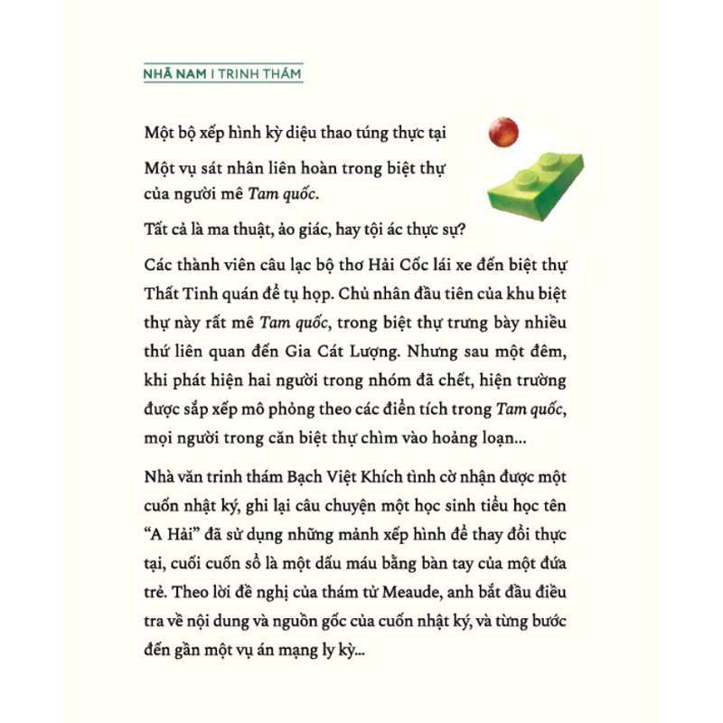 Mua tại TiktokTác giả: Bạch Nguyệt Hệ Dịch giả: Cao Đức Hiếu Nhà xuất bản: Hà Nội Kích thước: 14.5x20.5 cm Số trang: 420 Ngày phát hành: 2024 Giới thiệu sách Một bộ xếp hình kỳ diệu thao túng thực tại Một vụ s;át nhân liên hoàn trong biệt thự của người mê Tam quốc. Tất cả là m.a th'.uật, ảo giác, hay tội ác thực sự Các thành viên câu lạc bộ thơ Hải Cốc lái xe đến biệt thự Thất Tinh quán để tụ họp. Chủ nhân đầu tiên của khu biệt thự này rất mê Tam quốc, trong biệt thự trưng bày nhiều thứ liên quan đến Gia Cát Lượng. Nhưng sau một đêm, khi phát hiện hai người trong nhóm đã ch/ết, hiện trường được sắp xếp mô phỏng theo các điển tích trong Tam quốc, mọi người trong căn biệt thự chìm vào ho/ảng loạn...