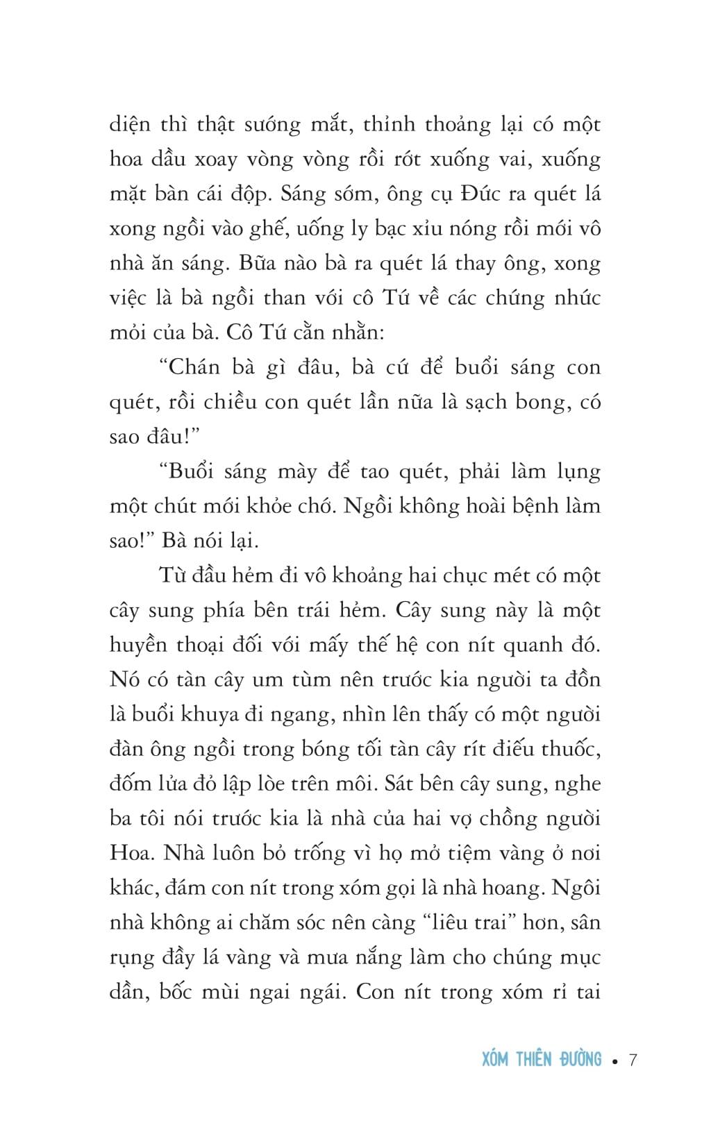 “Hoa lá quanh đây hình như đã góp phần tạo nên tính cách hiền hậu và mơ mộng của ba tôi. Đó là lí do ông yêu thương cái xóm nhỏ với những cây xanh mà cả xóm đồng lòng gìn giữ.”(Trích “Xóm thiên đường”)