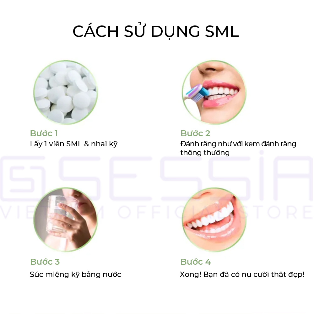 Với công thức thành phần hữu cơ 100% gốc tự nhiên trong dạng viên nén, SML sẽ giúp răng và lợi khỏe mạnh, nụ cười rạng rỡ và hơi thở thơm mát.
