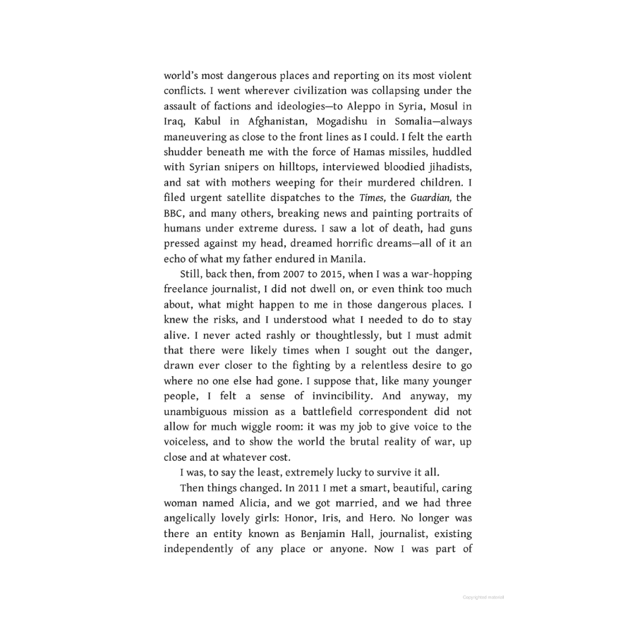 BENJAMIN HALL joined Fox News Channel in 2015. A longtime war correspondent who has covered conflicts around the world, he has written for the New York Times, the Sunday Times, the BBC, the Times (London), Agence France Presse, the Independent, and Esquire. He lives with his wife and three daughters in London.