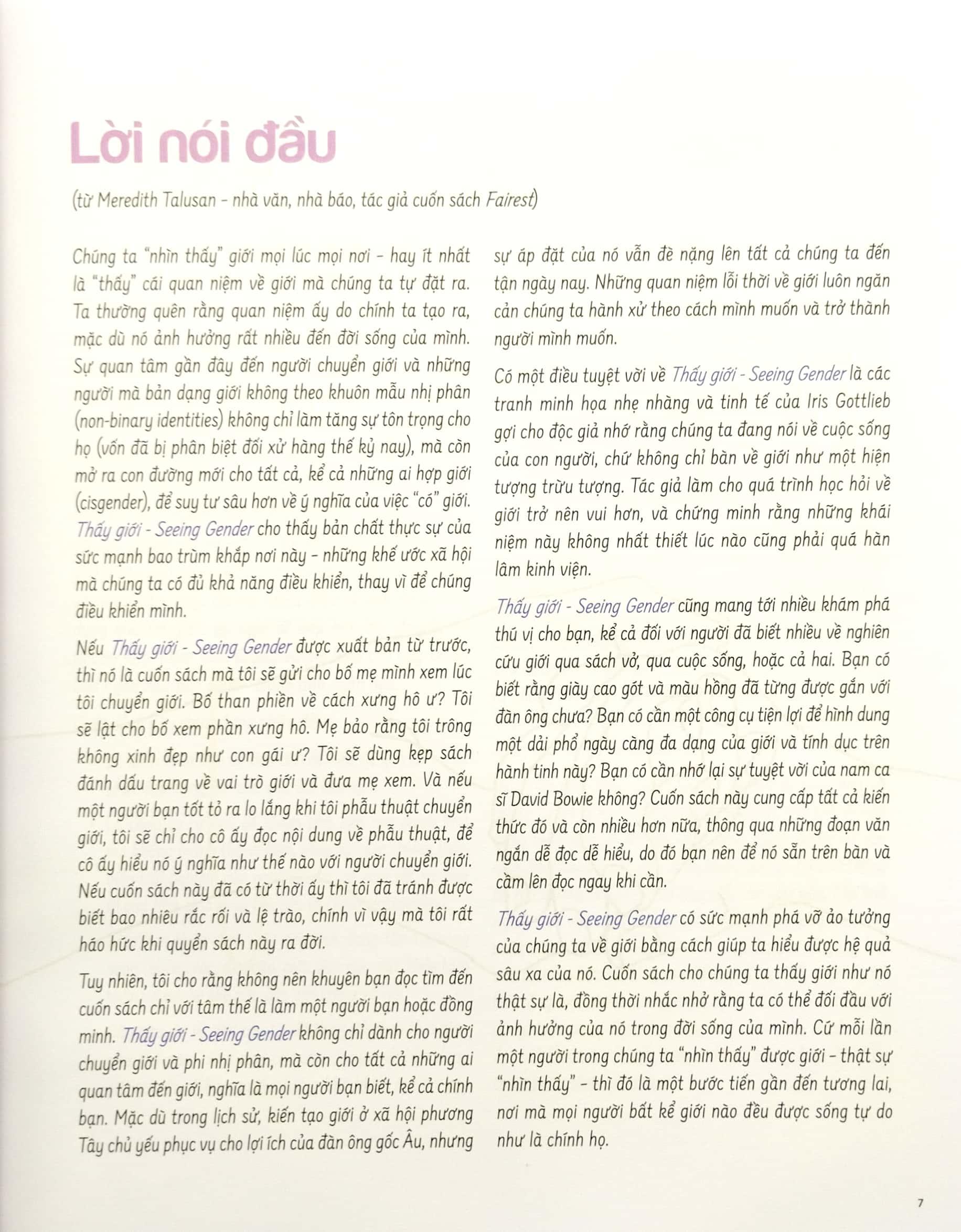 “Seeing Gender - Thấy giới” (Thục My dịch, Nhà xuất bản Phụ nữ Việt Nam phát hành) do tác giả queer Iris Gottlieb viết và vẽ minh họa. Cuốn sách cho thấy cách chúng ta hiểu và thể hiện sự phức tạp, đa chiều, đa góc cạnh của giới như thế nào. Nội dung được chia làm 3 phần: